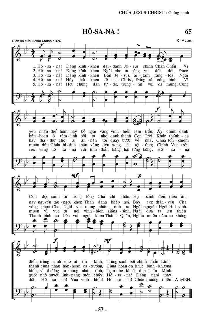 1. Đáng kính - khen đại - danh Jê-sus chính Chân -Thần Vì yêu nhân -thế hôm nay bỏ ngai vàng vinh - hiển lâm - trần; Ấy chính danh Con độc - sanh từ trong lòng Cha chí - thân, Hạ sanh đem theo ân - điển, trùng - sanh cho ai tin kính, Trùng - sanh bởi chính Thần - Linh. 2. Đáng kính - khen Ngài cho ta sống vui đời đời, Được hân hoan ở tâm - linh bởi ta nhờ danh thánh Con Trời; Khúc thánh - ca nay nguyễn tấu - ngợi khen Thần danh khắp nơi, Bầy con thân - yêu Cha thánh cùng nhau hân - hoan ca - xướng, Cùng hoan - ca khúc bình - khương. 3. Đáng kính - khen Bạn Jê-sus, ái - tâm rạng lòa, Ngài hay tha thứ cho ai ăn - năn tội quay bước về nhà; Chúa tốn khiêm vâng - phục Cha, Ngài vui mang nhân - tính ta, Ngài nguyên Ngôi Hai vinh - hiển, vì thương ta mang nhân - tính, Tạm che - khuất tính Thần - Minh. 4. Hãy hát - khen Jê-sus Christ, Đấng rất công - bình, Vì muôn dân Chúa hi - sinh thân vàng đền xong hết tội - tình; Chính Vua trên muôn vì vua từ nơi vinh - hiển giáng - sinh, Ngài đưa ta lên thiên quốc nhờ huyết linh - năng tuôn chảy; Hô - sa - na! Đáng ngợi thay! 5. Hỡi chúng dân tự do, trung - tín vui ca mừng, Cùng reo vang hô - sa - na với tinh - thần hăng hái tưng - bừng; Hô - sa - na! Thanh - bình - ca hòa vui ngợi - khen Thánh - Quân, Nghìn muôn năm ca không dứt, Hô - sa - na! Vua vinh - hiển! Hô - sa - na! Chúa thượng - thiên! A - MEN.