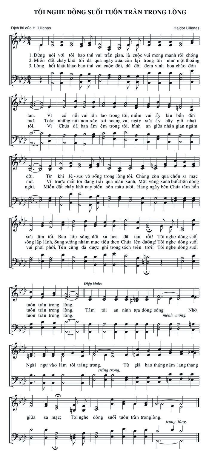 1. Đừng nói với tôi bao thú vui trần gian, là cuộc vui mong manh rồi chóng tan. Vì có nỗi vui lớn lao trong tôi, niềm vui ấy lâu bền đời. Từ khi Jê-sus vô sống trong lòng tôi. Chẳng còn qua chốn sa mạc xưa tăm tối, Bao lớp sóng đời xa hoa đã tan rồi! Tôi nghe dòng suối tuôn tràn trong lòng. 2. Miền đất cháy khô tôi đã qua ngày xưa, còn lại trong tôi như một thoáng mơ. Toàn những núi non xác xơ hoang vu, ngày xưa ấy bây giờ nhạt mờ. Vì trước mắt tôi đang trải qua màu xanh, Một vùng xanh biếc bên dòng sông lấp lánh, Sung sướng nhắm mục tiêu theo Chúa lên đường! Tôi nghe dòng suối tuôn tràn trong lòng. 3. Lòng hết khát khao bao thú vui cuộc đời, dù đời đem vinh hoa chào đón tôi. Vì Chúa đã ban ấm êm trong tôi, bình an giữa nhân gian ngậm ngùi. Miền đất cháy khô nay biến nên màu tươi, Hàng ngày bên Chúa tâm hồn vui phơi phới, Tên cũng đã được ghi trong sách trên trời! Tôi nghe dòng suối tuôn tràn trong lòng. chorus. Tâm tôi an ninh tựa dòng sông mênh mông, Nhờ Ngài ngự vào làm tôi tráng trong. Từ giã bao tháng năm lang thang trắng trong. giữa sa mạc; Tôi nghe dòng suối tuôn tràn trong lòng.