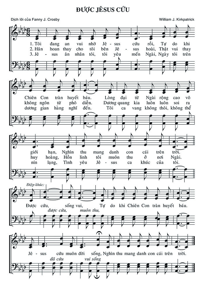 1. Tôi đang an vui nhờ Jê-sus cứu rồi, Tự do khi Chiên Con tràn huyết báu. Lòng đại từ Ngài rộng cao vô giới hạn, Nghìn thu mang danh con cái trên trời. 2. Hân hoan thay cho tôi bên Jê-sus hoài, Thật vui thay không ngôn từ phô diễn. Dương quang kia luôn luôn soi ra huy hoàng, Hồn linh tôi muôn thu ở nơi Ngài. 3. Jê-sus ân nhân tôi, tôi yêu mến Ngài, Ngày tôi trên dương gian hàng nghĩ đến. Tôi ca vang không thôi, không thể nín lặng, Tình yêu Jê-sus ca khúc của tôi. Điệp khúc: Được cứu, sống vui, Tự do khi Chiên Con tràn huyết báu. được cứu, muôn thu, Jê-sus cứu muôn đời sống, Nghìn thu mang danh con cái trên trời. đã cứu vui sống