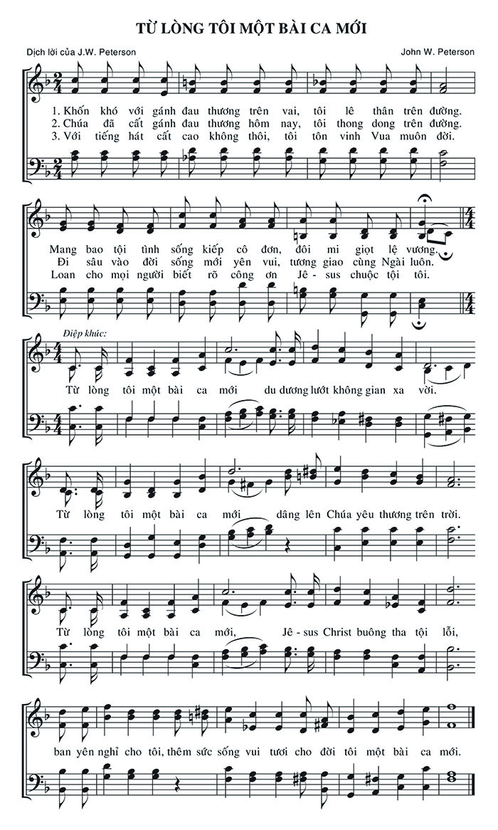1. Khốn khó với gánh đau thương trên vai, tôi lê thân trên đường. Mang bao tội tình sống kiếp cô đơn, đôi mi giọt lệ vương. 2. Chúa đã cất gánh đau thương hôm nay, tôi thong dong trên đường. Đi sâu vào đời sống mới yên vui, tương giao cùng Ngài luôn. 3. Với tiếng hát cất cao không thôi, tôi tôn vinh Vua muôn đời. Loan cho mọi người biết rõ công ơn Jê-sus chuộc tội tôi. Điệp khúc: Từ lòng tôi một bài ca mới du dương lướt không gian xa vời. Từ lòng tôi một bài ca mới dâng lên Chúa yêu thương trên trời. Từ lòng tôi một bài ca mới, Jê-sus Christ buông tha tội lỗi, ban yên nghỉ cho tôi, thêm sức sống vui tươi cho đời tôi một bài ca mới.