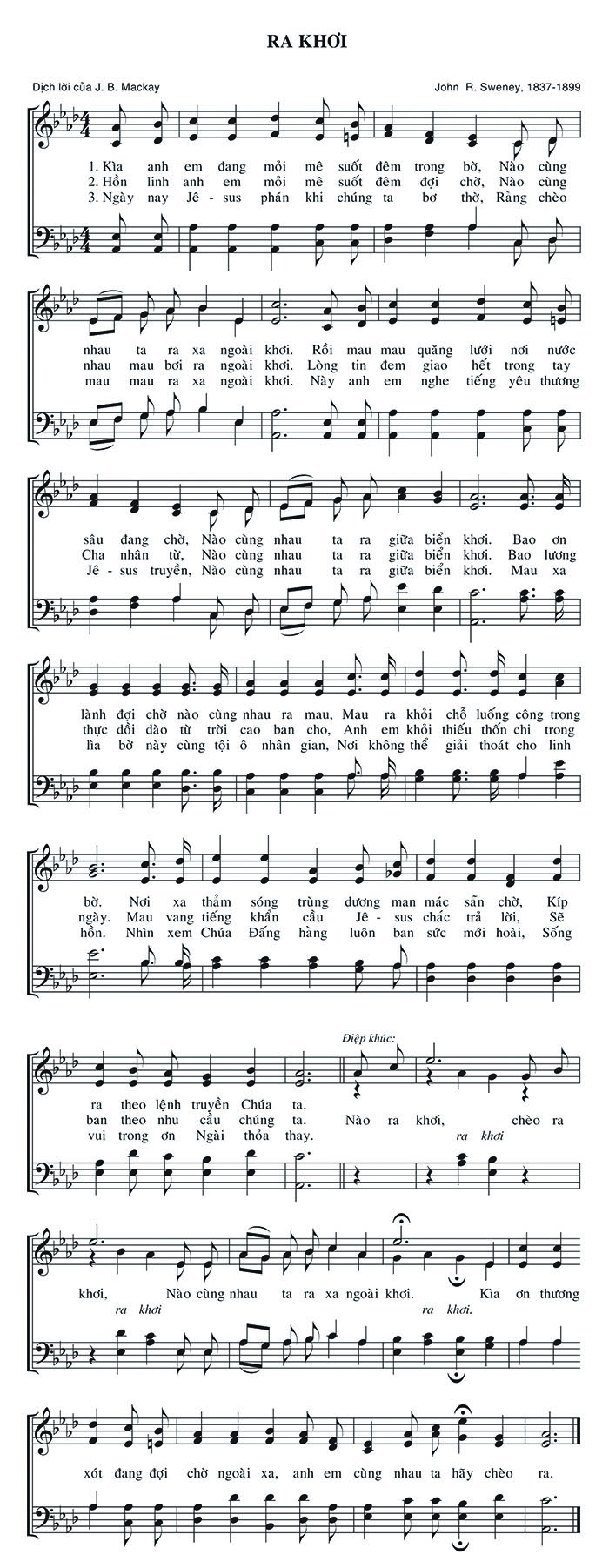 1. Kìa anh em đang mỏi mê suốt đêm trong bờ, Nào cùng nhau ta ra xa ngoài khơi. Rồi mau mau quăng lưới nơi nước sâu đang chờ, Nào cùng nhau ta ra giữa biển khơi. Bao ơn lành đợi chờ nào cùng nhau ra mau, Mau ra khỏi chỗ luống công trong bờ. Nơi xa thẳm sóng trùng dương man mác sẵn chờ, Kíp ra theo lệnh truyền Chúa ta. 2. Hồn linh anh em mỏi mê suốt đêm đợi chờ, Nào cùng nhau mau bơi ra ngoài khơi. Lòng tin đem giao hết trong tay Cha nhân từ, Nào cùng nhau ta ra giữa biển khơi. Bao lương thực dồi dào từ trời cao ban cho, Anh em khỏi thiếu thốn chi trong ngày. Mau vang tiếng khẩn cầu Jêsus chác trả lời, Sẽ ban theo nhu cầu chúng ta. 3. Ngày nay Jêsus phán khi chúng ta bơ thờ, Ràng chèo mau mau ra xa ngoài khơi. Này anh em nghe tiếng yêu thương Jêsus truyền, Nào cùng nhau ta ra giữa biển khơi. Mau xa lìa bờ này cùng tội ô nhân gian, Nơi không thể giải thoát cho linh hồn. Nhìn xem Chúa Đấng hằng luôn ban sức mới hoài, Sống vui trong ơn Ngài thỏa thay. Điệp khúc: Nào ra khơi, chèo ra ra khơi, ra khơi, Nào cùng nhau ta ra xa ngoài khơi. Kìa ơn thương xót đang đợi chờ ngoài xa, anh em cùng nhau ta hãy chèo ra.