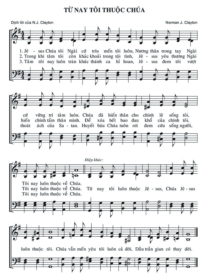 1. Jê-sus Chúa tôi Ngài cứ tríu mến tôi luôn, Nương thân trong tay Ngài cứ vững trí tâm luôn. Chúa đã hiến thân cho chính lẽ sống tôi, hiến chính tấm thân mình. Để xóa hết bao đau khổ của chính tôi, thoát ách của Sa-tan. Huyết báu Chúa tuôn rơi đem cứu sống người, 2. Trong khi tâm tôi còn khác khoải trong tội tình, Jê-sus yêu thương Ngài cứ vững trí tâm luôn. Chúa đã hiến thân cho chính lẽ sống tôi, hiến chính tấm thân mình. Để xóa hết bao đau khổ của chính tôi, thoát ách của Sa-tan. Huyết báu Chúa tuôn rơi đem cứu sống người, 3. Tâm tôi nay luôn tràn khúc thánh ca hỉ hoan, Jê-sus đem tôi vượt cứ vững trí tâm luôn. Chúa đã hiến thân cho chính lẽ sống tôi, hiến chính tấm thân mình. Để xóa hết bao đau khổ của chính tôi, thoát ách của Sa-tan. Huyết báu Chúa tuôn rơi đem cứu sống người, Điệp khúc: Tôi nay luôn thuộc về Chúa. Tôi nay luôn thuộc về Chúa. Từ nay tôi luôn thuộc Jê-sus, Chúa Jê-sus Tôi nay luôn thuộc về Chúa. luôn thuộc tôi. Chúa vẫn mến yêu tôi luôn cả đời, Dầu trần gian có thay dời.