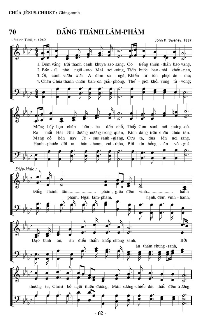 1. Đêm vắng trời thanh canh khuya sao sáng, Có tiếng thiên thần báo vang, Mừng bấy bọn chăn bôn ba đến chỗ, Thấy Con sanh nơi máng-cỏ. 2. Bác sĩ nhờ ngôi sao Mai soi sáng, Tiến bước bao nài khốn-nan, Ra mắt Hài Nhi đương nương trong quán, Kính dâng trân châu chúc tán, 3. Ôi, cảnh vườn xưa A-đam sa ngã, Khiến tử tôn phục ác ma; Máng cỏ hèn nay Jê-sus sanh giáng, Cứu ta, đưa lên nơi sáng. 4. Chân Chúa thành nhân ban ơn giải phóng, Thế giới khỏi vòng tử vong; Hạnh phước đời ta hân hoan, vui thỏa, Bởi tin hồng ân vô giá. Điệp khúc: Đấng Thánh lâm phàm, giữa đêm vinh hạnh, phàm, Ngài lâm phàm, hạnh, đêm vinh hạnh, Đạo bình an, ân điển thấm khắp chúng sanh, Bởi ân thấm chúng sanh, thương ta, Christ bỏ ngôi thiên đường, Màn sương chiếu đất thấu đêm trường.