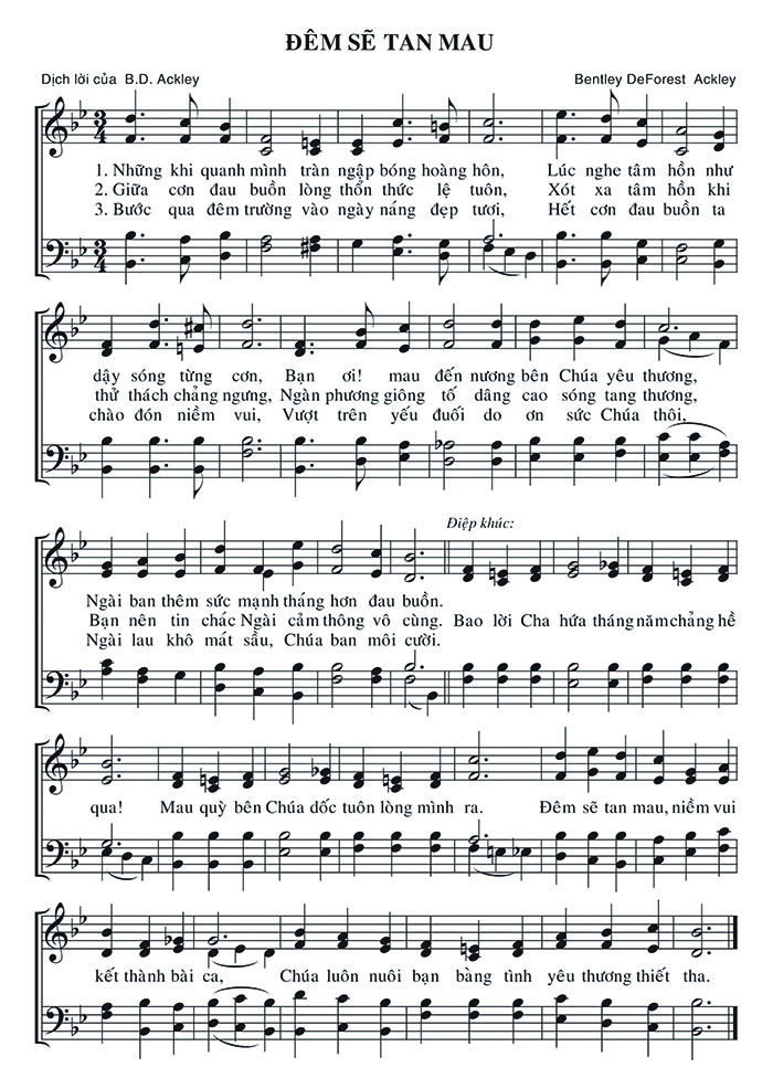 1. Những khi quanh mình tràn ngập bóng hoàng hôn, Lúc nghe tâm hồn như dậy sóng từng cơn, Bạn ơi! mau đến nương bên Chúa yêu thương, Vượt trên yếu đuối do ơn sức Chúa thôi. 2. Giữa cơn đau buồn lòng thổn thức lệ tuôn, Xót xa tâm hồn khi thử thách chẳng ngưng, Ngàn phương giông tố dâng cao sóng tang thương, Vượt trên yếu đuối do ơn sức Chúa thôi. 3. Bước qua đêm trường vào ngày nắng đẹp tươi, Hết cơn đau buồn ta chào đón niềm vui, Vượt trên yếu đuối do ơn sức Chúa thôi. 4. Mau quỳ bên Chúa dốc tuôn lòng mình ra. Đêm sẽ tan mau, niềm vui kết thành bài ca, Chúa luôn nuôi bạn bàng tình yêu thương thiết tha. Điệp khúc: Ngài ban thêm sức mạnh tháng hơn đau buồn. Bạn nên tin chác Ngài cảm thông vô cùng. Bao lời Cha hứa tháng năm chẳng hề Ngài lau khô mát sầu, Chúa ban môi cười.