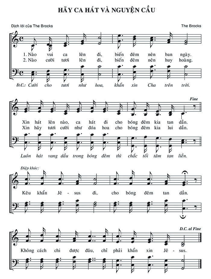 1. Nào vui ca lên đi, biến đêm nên ban ngày. Cười cho tươi như hoa, khẩn xin Cha trên trời. Xin hát lên nào, ca hát đi cho bóng đêm kia tan dần. Luôn hát vang dầu trong bóng đêm thì chắc tối tăm tan liền. 2. Nào cười tươi lên đi, biến đêm nên huy hoàng. Cười cho tươi như hoa, khẩn xin Cha trên trời. Xin hãy tươi cười như đóa hoa cho bóng đêm kia lui dần. Luôn hát vang dầu trong bóng đêm thì chắc tối tăm tan liền. Điệp khúc: Kêu khẩn Jê-sus đi, cho bóng đêm tan dần. Không cách chi được đâu, chỉ phải khẩn xin Jê-sus.