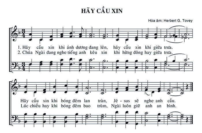 1. Hãy cầu xin khi ánh dương đang lên, hãy cầu xin khi giữa trưa. Hãy cầu xin khi bóng đêm lan tràn, Jê-sus sẽ nghe anh cầu. 2. Chúa Ngài đang nghe tiếng anh kêu xin khi hừng đông hay giữa trưa. Lúc chiều hay khi bóng đêm bao trùm, Ngài luôn giữ anh an bình.