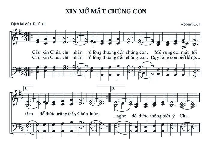 1. Cầu xin Chúa chí nhân rủ lòng thương đến chúng con. Mở rộng đôi mắt tối tăm để được trông thấy Chúa luôn. 2. Cầu xin Chúa chí nhân rủ lòng thương đến chúng con. Dạy lòng con biết lắng nghe để được thông biết ý Cha.
