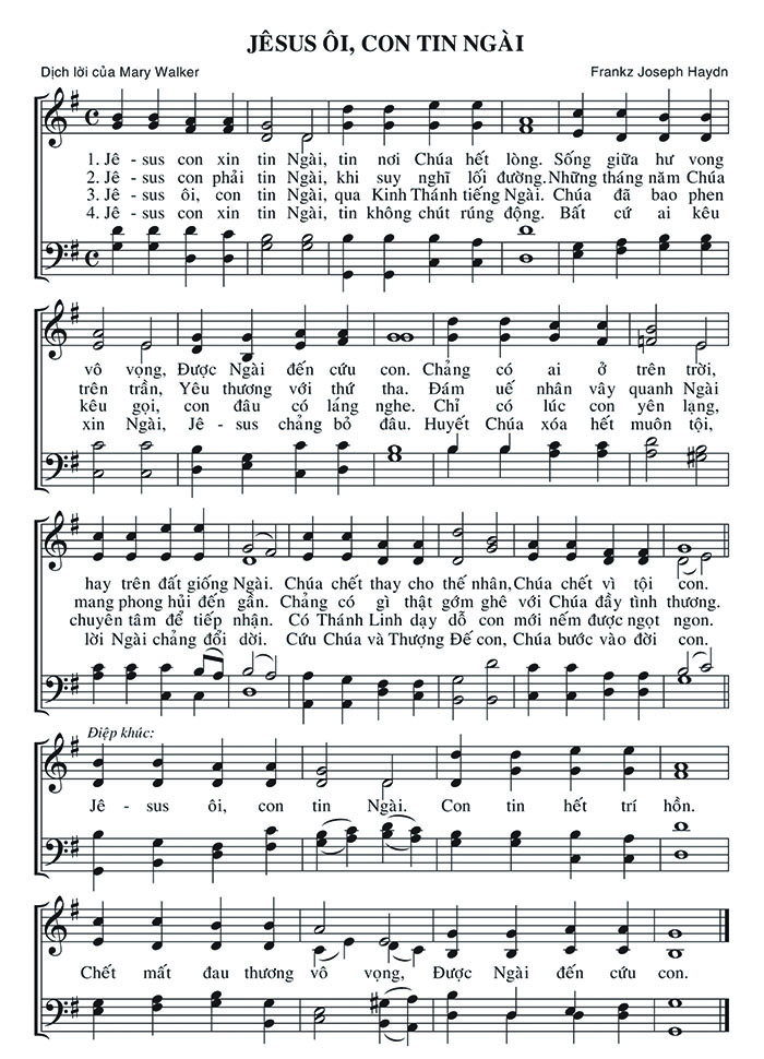 1. Jê-sus con xin tin Ngài, tin nơi Chúa hết lòng. Sống giữa hư vọng, vô vọng, Được Ngài đến cứu con. Chẳng có ai ở trên trời, hay trên đất giống Ngài. Chúa chết thay cho thế nhân, Chúa chết vì tội con. 2. Jê-sus con phải tin Ngài, khi suy nghĩ lối đường. Những tháng năm Chúa trên trần, Yêu thương với thứ tha. Đám uế nhân vây quanh Ngài mang phong hủi đến gần. Chẳng có gì thật gớm ghê với Chúa đầy tình thương. 3. Jê-sus ôi, con tin Ngài, qua Kinh Thánh tiếng Ngài. Chúa đã bao phen kêu gọi, con đâu có lắng nghe. Chỉ có lúc con yên lặng, chuyên tâm để tiếp nhận. Có Thánh Lình dạy dỗ con mới nếm được ngọt ngon. 4. Jê-sus con xin tin Ngài, tin không chút rúng động. Bất cứ ai kêu xin Ngài, Jê-sus chẳng bỏ đâu. Huyết Chúa xóa hết muôn tội, lời Ngài chẳng đổi dời. Cứu Chúa và Thượng Đế con, Chúa bước vào đời con. Điệp khúc: Jê-sus ôi, con tin Ngài. Con tin hết trí hồn. Chết mất đau thương vô vọng, Được Ngài đến cứu con.