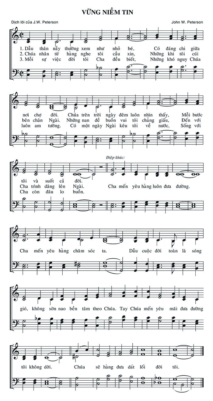 1. Dẫu thân nầy thường xem như nhỏ bé, Có đáng chi giữa nơi chợ đời. Chúa trên trời ngày đêm luôn nhìn thấy, Mỗi bước tôi và suốt cả đời. Cha mến yêu hàng luôn đưa đường. Cha mến yêu hàng chăm sóc ta. Dẫu cuộc đời toàn là sóng gió, không sờn nao bền tâm theo Chúa. Tay Chúa mến yêu mãi đưa đường tôi không dời. 2. Chúa nhân từ hàng nghe tôi cầu xin, Những khi tôi cúi bên chân Ngài. Những nan đề buồn vui tôi chẳng giấu, Đến với Cha trình dâng lên Ngài. Cha mến yêu hàng luôn đưa đường. Cha mến yêu hàng chăm sóc ta. Dẫu cuộc đời toàn là sóng gió, không sờn nao bền tâm theo Chúa. Tay Chúa mến yêu mãi đưa đường Chúa sẽ hàng đưa dắt lối đời tôi. 3. Mỗi sự việc đời tôi Cha đều biết, Những khó nguy Chúa luôn am tường. Có một ngày Ngài kêu tôi về nước, Sống với Cha còn đâu lo buồn. Cha mến yêu hàng luôn đưa đường. Cha mến yêu hàng chăm sóc ta. Dẫu cuộc đời toàn là sóng gió, không sờn nao bền tâm theo Chúa. Tay Chúa mến yêu mãi đưa đường Chúa sẽ hàng đưa dắt lối đời tôi. Điệp khúc: Cha mến yêu hàng luôn đưa đường. Cha mến yêu hàng chăm sóc ta. Dẫu cuộc đời toàn là sóng gió, không sờn nao bền tâm theo Chúa. Tay Chúa mến yêu mãi đưa đường Chúa sẽ hàng đưa dắt lối đời tôi.