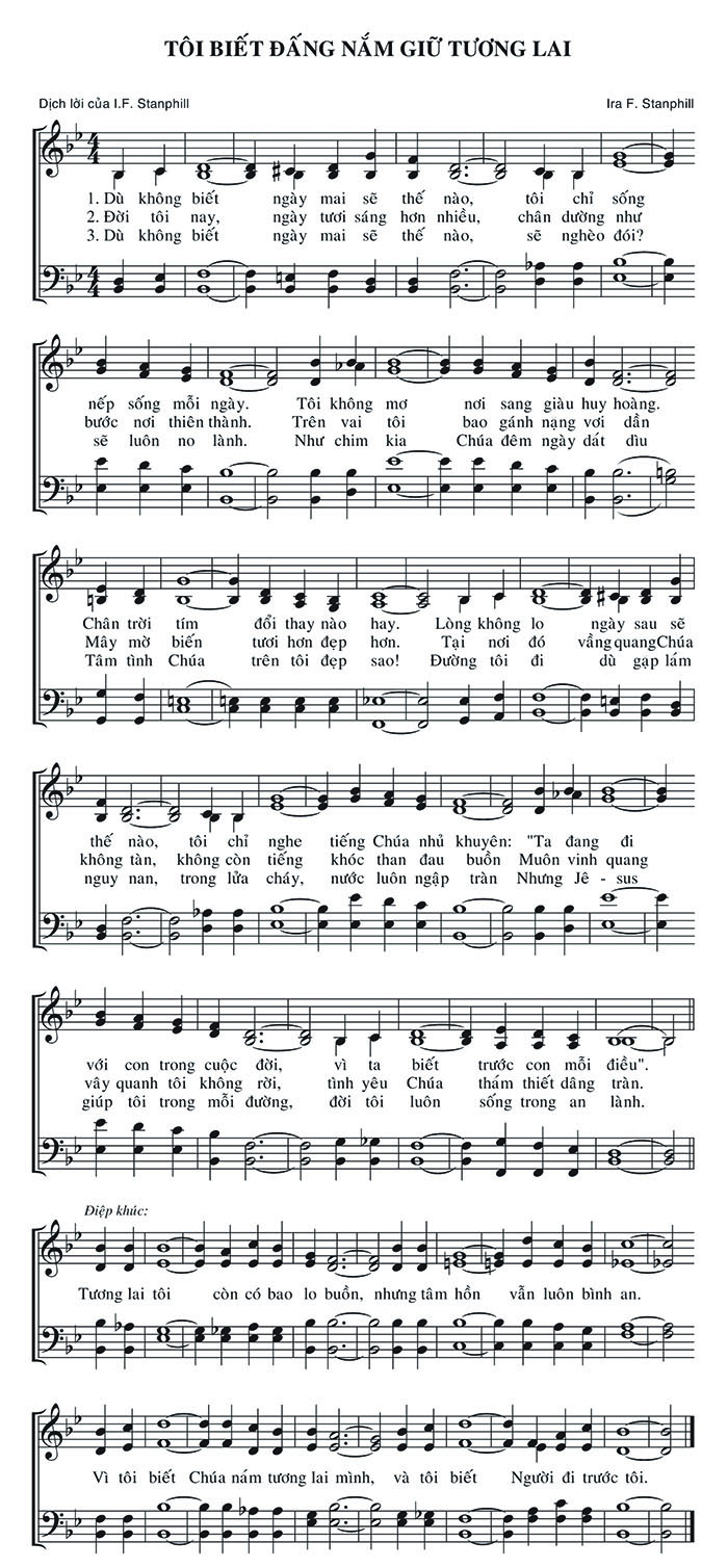 1. Dù không biết ngày mai sẽ thế nào, tôi chỉ sống nếp sống mỗi ngày. Tôi không mơ nơi sang giàu huy hoàng. Chân trời tím đổi thay nào hay. Lòng không lo ngày sau sẽ thế nào, tôi chỉ nghe tiếng Chúa nhủ khuyên: "Ta đang đi với con trong cuộc đời, vì ta biết trước con mỗi điều". 2. Đời tôi nay, ngày tươi sáng hơn nhiều, chân dường như bước nơi thiên thành. Trên vai tôi bao gánh nặng vơi dần Mây mờ biến tươi hơn đẹp hơn. Tại nơi đó vắng quang Chúa không tàn, không còn tiếng khóc than đau buồn Muôn vinh quang vây quanh tôi không rời, tình yêu Chúa thắm thiết dâng tràn. 3. Dù không biết ngày mai sẽ thế nào, sẽ nghèo đói? Như chim kia Chúa đêm ngày dắt dìu Tâm tình Chúa trên tôi đẹp sao! Đường tôi đi dù gặp lắm nguy nan, trong lửa cháy, nước luôn ngập tràn Nhưng Jê-sus giúp tôi trong mỗi đường, đời tôi luôn sống trong an lành. Điệp khúc: Tương lai tôi còn có bao lo buồn, nhưng tâm hồn vẫn luôn bình an. Vì tôi biết Chúa nắm tương lai mình, và tôi biết Người đi trước tôi.
