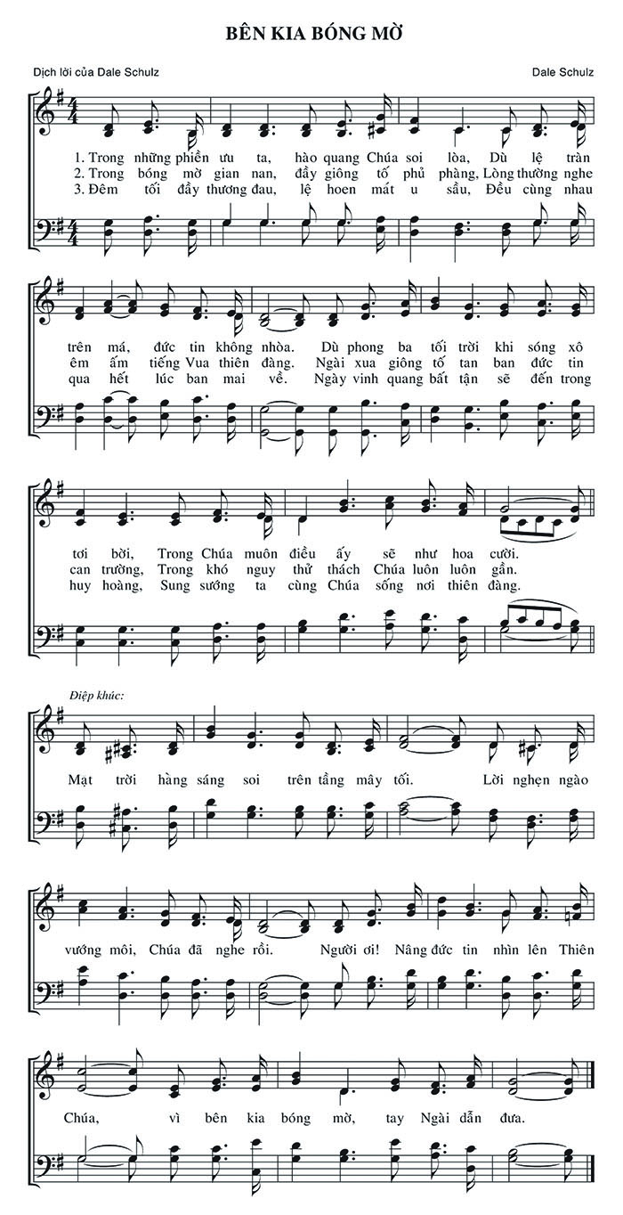 1. Trong những phiền ưu ta, hào quang Chúa soi lòa, Dù lệ tràn trên má, đức tin không nhòa. Dù phong ba tối trời khi sóng xô tới bời, Trong Chúa muôn điều ấy sẽ như hoa cười. 2. Trong bóng mờ gian nan, đầy giông tố phủ phàng, Lòng thường nghe êm ẩm tiếng Vua thiên đàng. Ngài xua giông tố tan ban đức tin can trường, Trong khó nguy thử thách Chúa luôn luôn gần. 3. Đêm tối đầy thương đau, lệ hoen mắt u sầu, Đều cùng nhau qua hết lúc ban mai về. Ngày vinh quang bất tận sẽ đến trong huy hoàng, Sung sướng ta cùng Chúa sống nơi thiên đàng. Điệp khúc: Mặt trời hằng sáng soi trên tầng mây tối. Lời nghẹn ngào vướng môi, Chúa đã nghe rồi. Người ơi! Nâng đức tin nhìn lên Thiên Chúa, vì bên kia bóng mờ, tay Ngài dẫn đưa.