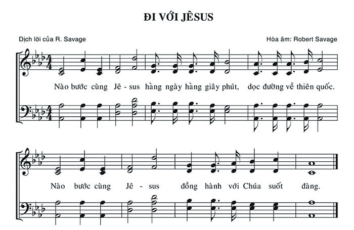 1. Nào bước cùng Jê-sus hàng ngày hàng giây phút, dọc đường về thiên quốc. Nào bước cùng Jê-sus đồng hành với Chúa suốt đàng.