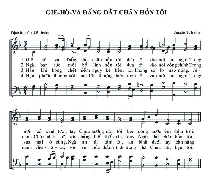 1. Giê-hô-va Đấng dắt chăn hồn tôi, đưa tôi vào nơi an nghỉ. Trong nơi cỏ xanh tươi, tay Chúa hướng dẫn tôi bên dòng nước êm đềm trôi. 2. Ngài ban sức mới bổ linh hồn tôi, đưa tôi vào nơi công chính. Trong danh Chúa nhân từ, tôi chẳng thiếu thốn chi, duy Ngài dắt chăn hồn tôi. 3. Hầu khi bóng chết hiểm nguy kề bên, tôi không sợ lo nao núng. Jê-sus mãi ở cùng, Ngài an ủi tâm tôi, an bình dưới tay toàn năng. 4. Hạnh phước, thương xót của Cha thượng thiên, theo tôi vào nơi an nghỉ. Trong danh Giê-hô-va, tôi vui thỏa thảnh thơi trong nhà Chúa tôi, bạn tôi.