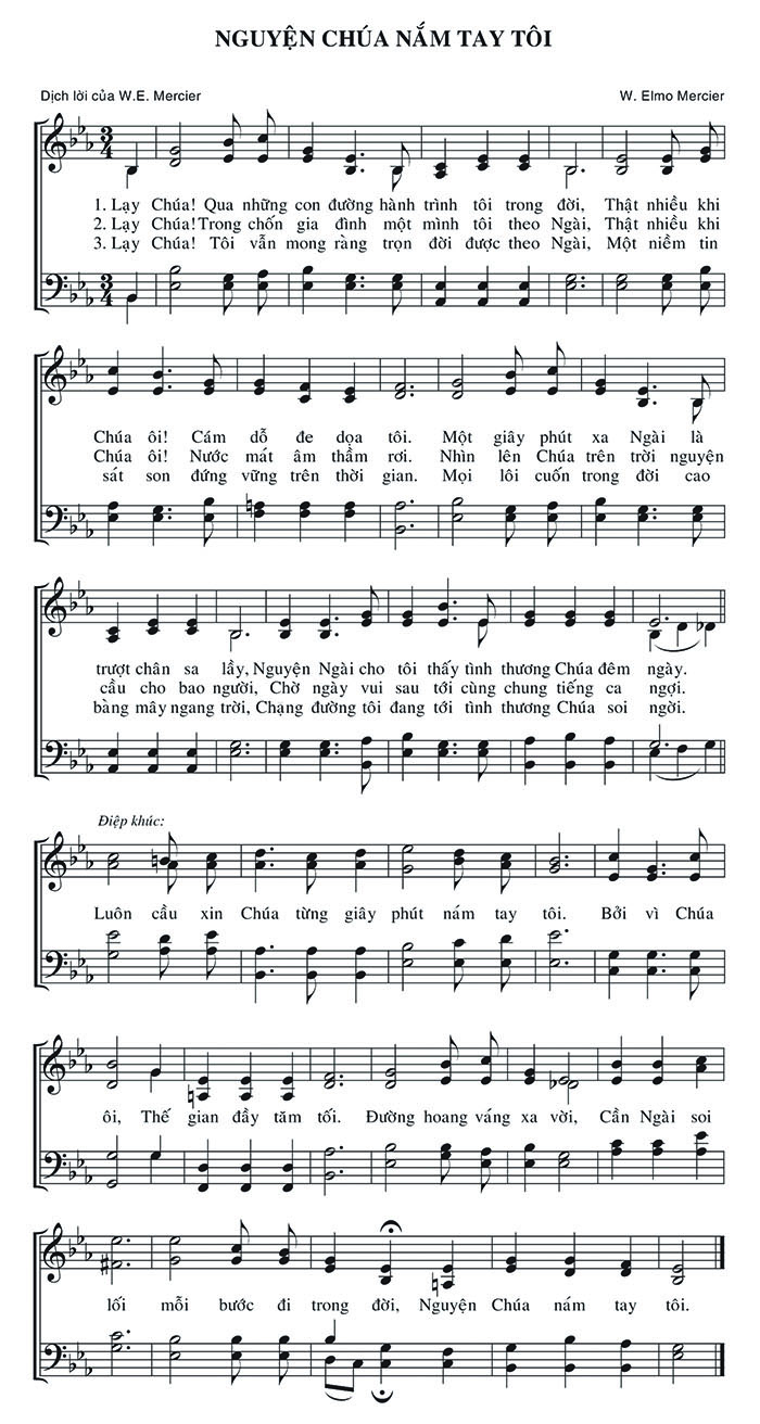 1. Lạy Chúa! Qua những con đường hành trình tôi trong đời, Thật nhiều khi Chúa ôi! Cám dỗ đe dọa tôi. Một giây phút xa Ngài là trượt chân sa lầy, Nguyện Ngài cho tôi thấy tình thương Chúa đêm ngày. 2. Lạy Chúa! Trong chốn gia đình một mình tôi theo Ngài, Thật nhiều khi Chúa ôi! Nước mắt âm thầm rơi. Nhìn lên Chúa trên trời nguyện cầu cho bao người, Chờ ngày vui sau tới cùng chung tiếng ca ngợi. 3. Lạy Chúa! Tôi vẫn mong rằng trọn đời được theo Ngài, Một niềm tin sát son đứng vững trên thời gian. Mọi lôi cuốn trong đời cao bằng mây ngang trời, Chặng đường tôi đang tới tình thương Chúa soi ngời. Điệp khúc: Luôn cầu xin Chúa từng giây phút nắm tay tôi. Bởi vì Chúa ôi, Thế gian đầy tăm tối. Đường hoang vắng xa vời, Cần Ngài soi lối mỗi bước đi trong đời, Nguyện Chúa nắm tay tôi.