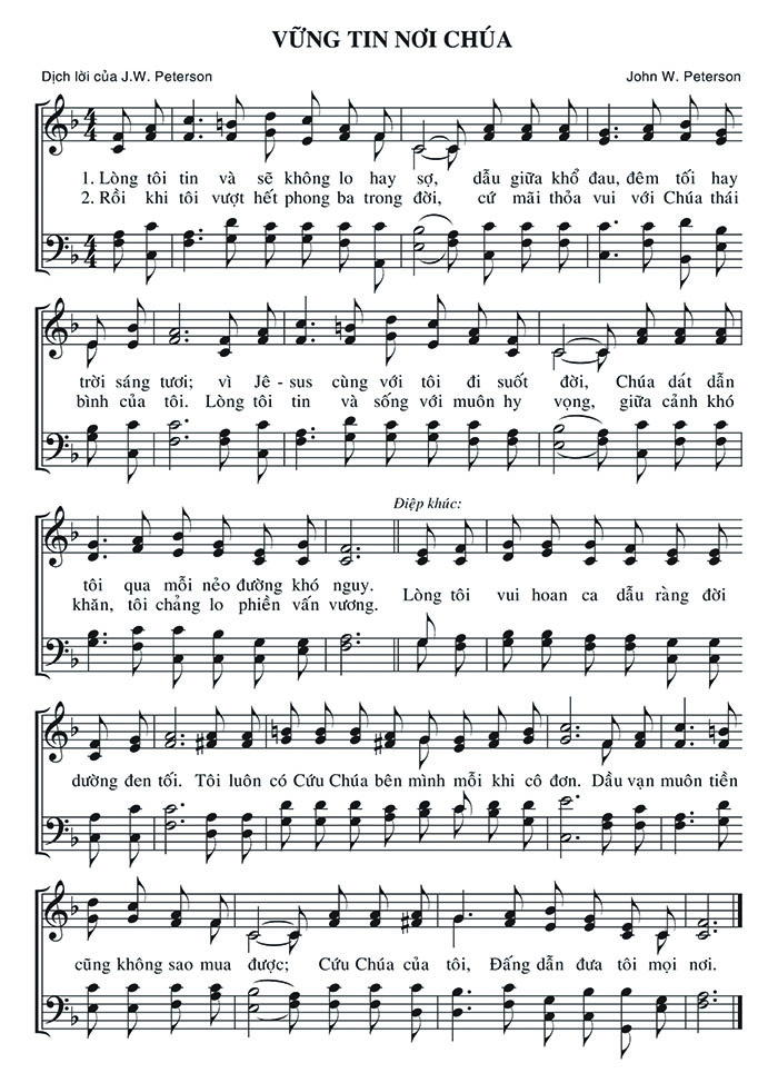 1. Lòng tôi tin và sẽ không lo hay sợ, dẫu giữa khổ đau, đêm tối hay trời sáng tươi; vì Jêsus cùng với tôi đi suốt đời, Chúa dắt dẫn bình của tôi. 2. Rồi khi tôi vượt hết phong ba trong đời, cứ mãi thỏa vui với Chúa thái bình của tôi. Lòng tôi tin và sống với muôn hy vọng, giữa cảnh khó khăn, tôi chẳng lo phiền vấn vương. Điệp khúc: Lòng tôi vui hoan ca dẫu rằng đời tôi qua mỗi nẻo đường khó nguy. dường đen tối. Tôi luôn có Cứu Chúa bên mình mỗi khi cô đơn. Dầu vạn muôn tiền cũng không sao mua được; Cứu Chúa của tôi, Đấng dẫn đưa tôi mọi nơi.