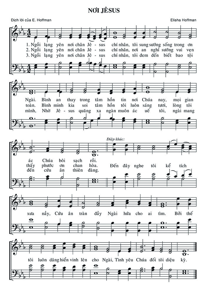 1. Ngồi lặng yên nơi chân Jê-sus chí nhân, tôi sung sướng sống trong ơn Ngài. Bình an thay trong tâm hồn tin nơi Chúa nay, mọi gian toàn. 2. Ngồi lặng yên nơi chân Jê-sus chí nhân, nơi an nghỉ sướng vui vẹn mình, Bình minh kia soi tâm hồn tôi luôn sáng tươi, lòng tôi luôn dâng hiển vinh lên cho Ngài, Tình yêu Chúa đối tôi diệu kỳ. 3. Ngồi lặng yên nơi chân Jê-sus chí nhân, tôi đem đến biết bao tội mình, Nhờ Jê-sus quăng xa ngàn muôn ác uế tôi, ngài mang xưa nầy, Cứu ân tràn đầy Ngài hứa cho ai tìm. Bởi thế tôi luôn dâng hiển vinh lên cho Ngài, Tình yêu Chúa đối tôi diệu kỳ. Điệp khúc: ác Chúa bôi sạch rồi. Đến đây nghe tôi kể tích thấy phước ơn chan hòa. Đến đây nghe tôi kể tích đến cứu ân thiên đàng. Đến đây nghe tôi kể tích xưa nầy, Cứu ân tràn đầy Ngài hứa cho ai tìm. Bởi thế tôi luôn dâng hiển vinh lên cho Ngài, Tình yêu Chúa đối tôi diệu kỳ.