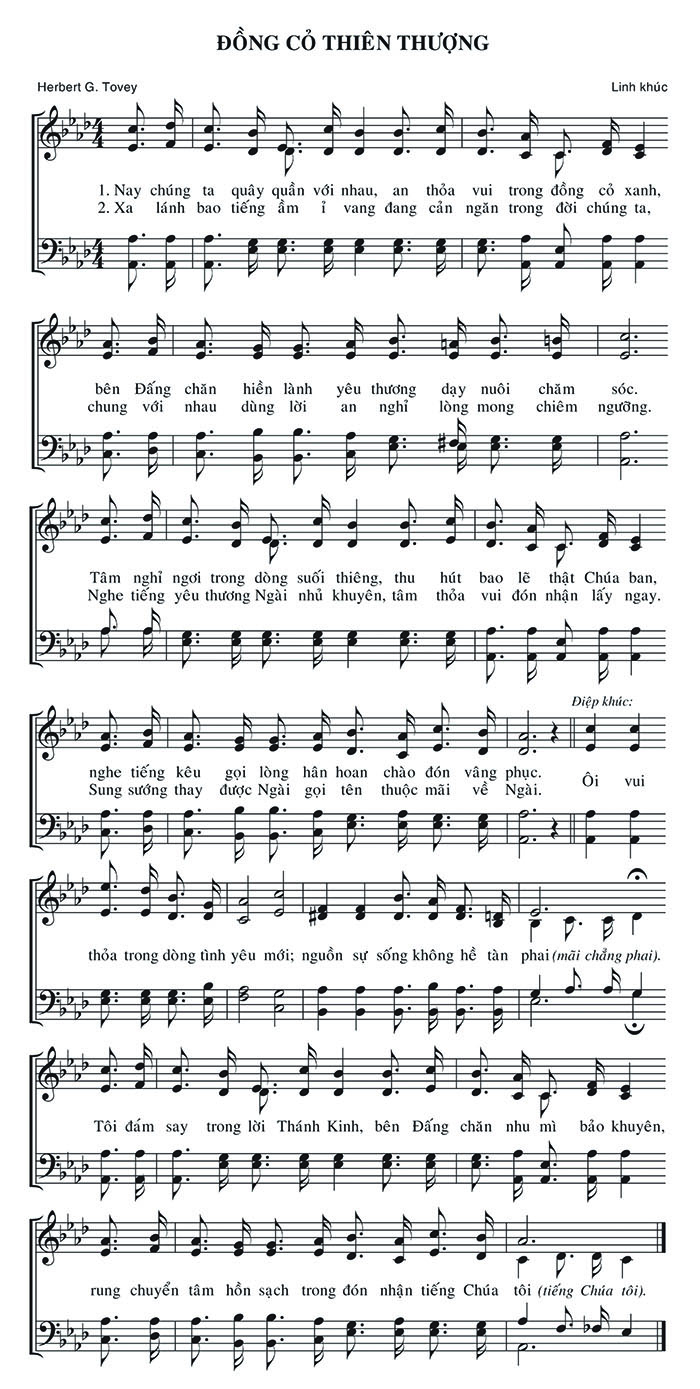 1. Nay chúng ta quây quần với nhau, an thỏa vui trong đồng cỏ xanh, bên Đấng chăn hiền lành yêu thương dạy nuôi chăm sóc. Tâm nghỉ ngơi trong dòng suối thiêng, thu hút bao lẽ thật Chúa ban, thỏa trong dòng tình yêu mới; nguồn sự sống không hề tàn phai (mãi chẳng phai). Tôi đám say trong lời Thánh Kinh, bên Đấng chăn nhu mì bảo khuyên, rung chuyển tâm hồn sạch trong đón nhận tiếng Chúa tôi (tiếng Chúa tôi). 2. Xa lánh bao tiếng ầm ỉ vang đang cản ngăn trong đời chúng ta, chung với nhau dùng lời an nghỉ lòng mong chiêm ngưỡng. Nghe tiếng yêu thương Ngài nhủ khuyên, tâm thỏa vui đón nhận lấy ngay. nghe tiếng kêu gọi lòng hân hoan chào đón vâng phục. Sung sướng thay được Ngài gọi tên thuộc mãi về Ngài. Điệp khúc: Ôi vui