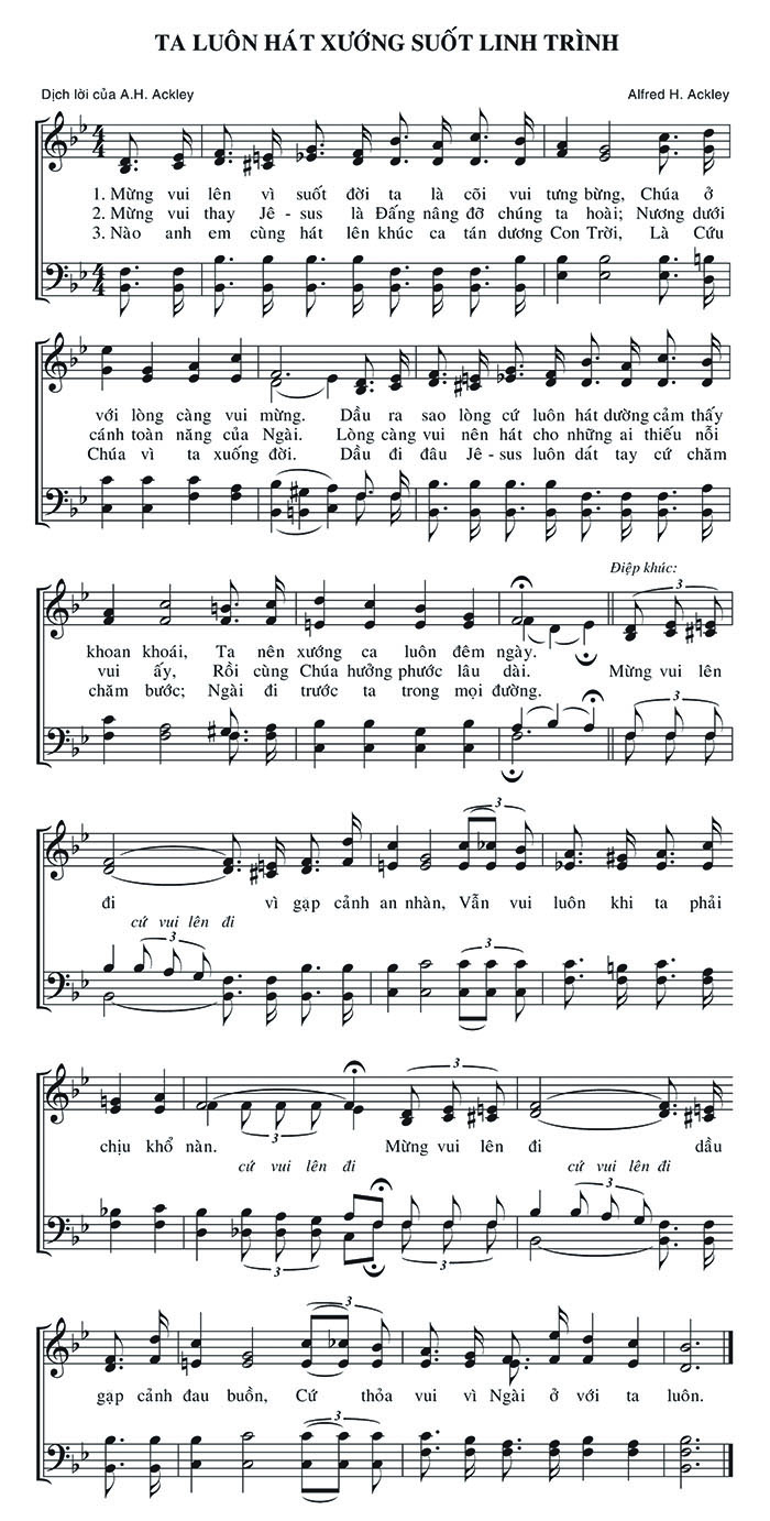 1. Mừng vui lên vì suốt đời ta là cõi vui tưng bừng, Chúa ở với lòng càng vui mừng. Dầu ra sao lòng cứ luôn hát dường cảm thấy đi vì gạp cảnh an nhàn, Vẫn vui luôn khi ta phải chịu khổ nàn. Mừng vui lên đi dầu gạp cảnh đau buồn, Cứ thỏa vui vì Ngài ở với ta luôn. 2. Mừng vui thay Jêsus là Đấng nâng đỡ chúng ta hoài; Nương dưới cánh toàn năng của Ngài. Lòng càng vui nên hát cho những ai thiếu nỗi vui ấy, Rồi cùng Chúa hưởng phước lâu dài. Mừng vui lên đi dầu gạp cảnh đau buồn, Cứ thỏa vui vì Ngài ở với ta luôn. 3. Nào anh em cùng hát lên khúc ca tán dương Con Trời, Là Cứu Chúa vì ta xuống đời. Dầu đi đâu Jêsus luôn dát tay cứ chăm chăm bước; Ngài đi trước ta trong mọi đường. Mừng vui lên đi dầu gạp cảnh đau buồn, Cứ thỏa vui vì Ngài ở với ta luôn. Điệp khúc: Mừng vui lên khoan khoái, Ta nên xướng ca luôn đêm ngày. Mừng vui lên đi cứ vui lên đi cứ vui lên đi.