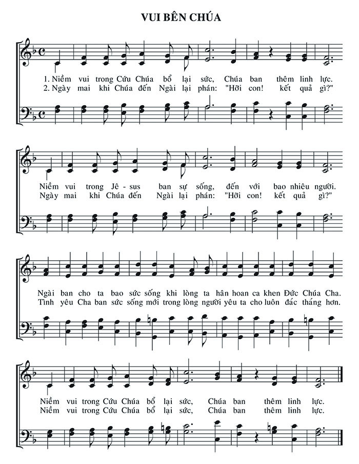 1. Niềm vui trong Cứu Chúa bổ lại sức, Chúa ban thêm linh lực. Niềm vui trong Jê-sus ban sự sống, đến với bao nhiêu người. Ngài ban cho ta bao sức sống khi lòng ta hân hoan ca khen Đức Chúa Cha. Niềm vui trong Cứu Chúa bổ lại sức, Chúa ban thêm linh lực. 2. Ngày mai khi Chúa đến Ngài lại phán: "Hỡi con! kết quả gì?" Ngày mai khi Chúa đến Ngài lại phán: "Hỡi con! kết quả gì?" Tình yêu Cha ban sức sống mới trong lòng người yêu ta cho luôn đắc thắng hơn. Niềm vui trong Cứu Chúa bổ lại sức, Chúa ban thêm linh lực.