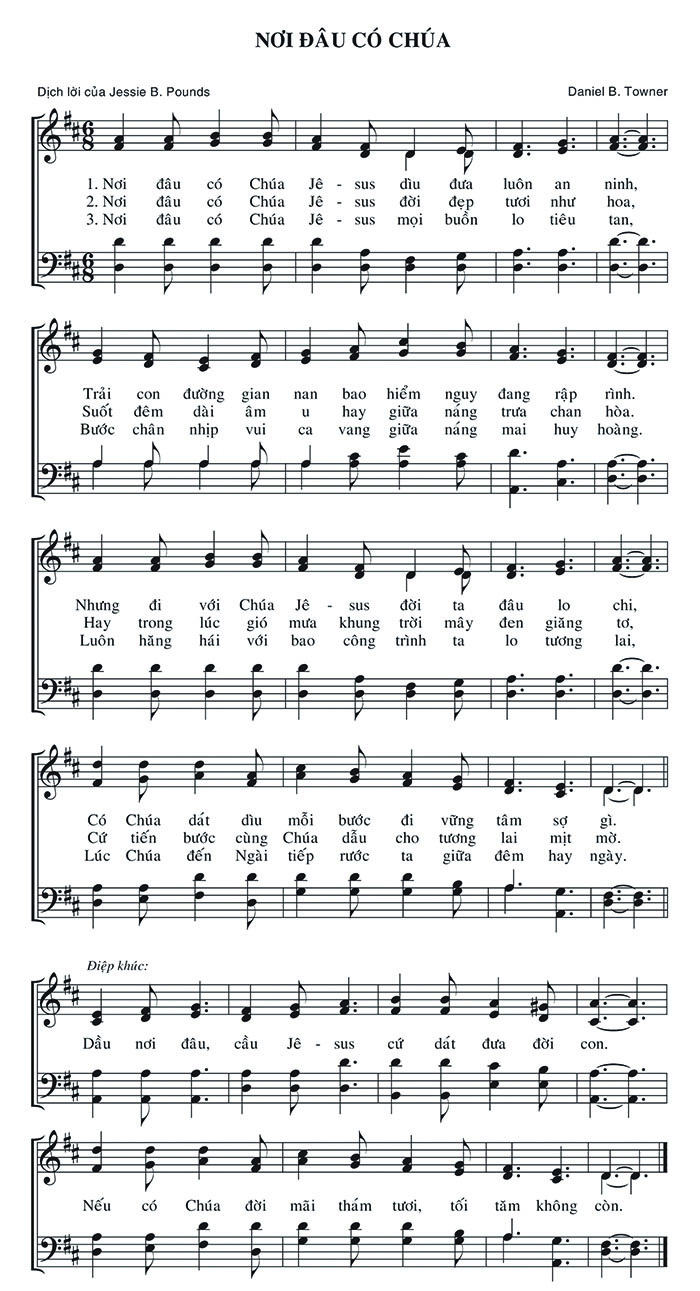 1. Nơi đâu có Chúa Jê-sus dìu đưa luôn an ninh, Trải con đường gian nan bao hiểm nguy đang rập rình. Nhưng đi với Chúa Jê-sus đời ta đâu lo chi, Có Chúa dắt dìu mỗi bước đi vững tâm sợ gì. 2. Nơi đâu có Chúa Jê-sus đời đẹp tươi như hoa, Suốt đêm dài âm u hay giữa nắng trưa chan hòa. Hay trong lúc gió mưa khung trời mây đen giăng tơ, Cứ tiến bước cùng Chúa dẫu cho tương lai mịt mờ. 3. Nơi đâu có Chúa Jê-sus mọi buồn lo tiêu tan, Bước chân nhịp vui ca vang giữa nắng mai huy hoàng. Luôn hăng hái với bao công trình ta lo tương lai, Lúc Chúa đến Ngài tiếp rước ta giữa đêm hay ngày. chorus. Dầu nơi đâu, cầu Jê-sus cứ dắt đưa đời con. Nếu có Chúa đời mãi thắm tươi, tối tăm không còn. Điệp khúc: Dầu nơi đâu, cầu Jê-sus cứ dắt đưa đời con. Nếu có Chúa đời mãi thắm tươi, tối tăm không còn.