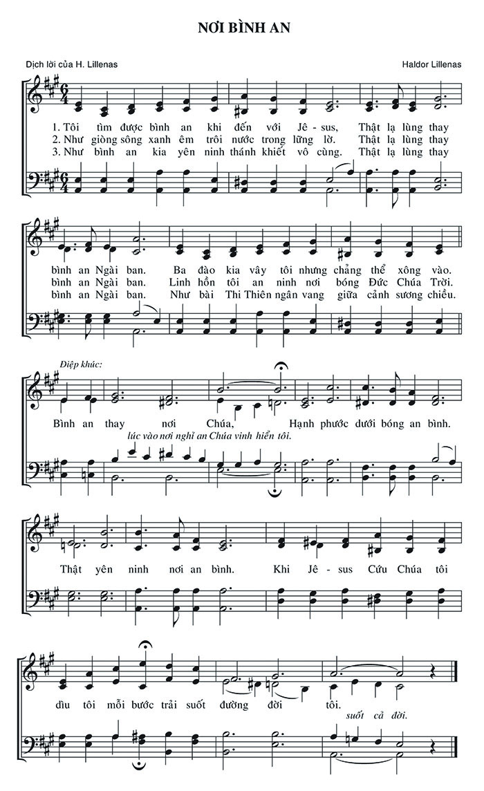1. Tôi tìm được bình an khi đến với Jê-sus, Thật lạ lùng thay bình an Ngài ban. Ba đào kia vây tôi nhưng chẳng thể xông vào. 2. Như giòng sông xanh êm trôi nước trong lững lờ. Thật lạ lùng thay bình an Ngài ban. Linh hồn tôi an ninh nơi bóng Đức Chúa Trời. 3. Như bình an kia yên ninh thánh khiết vô cùng. Thật lạ lùng thay bình an Ngài ban. Như bài Thi Thiên ngân vang giữa cảnh sương chiều. 4. Thật yên ninh nơi an bình. Khi Jê-sus Cứu Chúa tôi dìu tôi mỗi bước trải suốt đường đời tôi. suốt cả đời. Điệp khúc: Bình an thay nơi Chúa, Hạnh phước dưới bóng an bình. lúc vào nơi nghỉ an Chúa vinh hiển tôi.