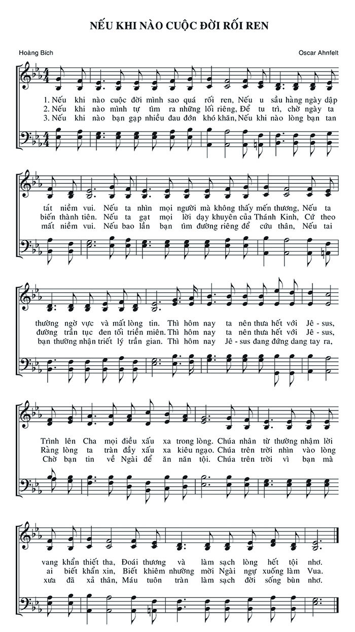 1. Nếu khi nào cuộc đời mình sao quá rối ren, Nếu u sầu hàng ngày dập tát niềm vui. Nếu ta nhìn mọi người mà không thấy mến thương, Nếu ta thường ngờ vực và mất lòng tin. Thì hôm nay ta nên thưa hết với Jê-sus, Trình lên Cha mọi điều xấu xa trong lòng. Chúa nhân từ thường nhậm lời vang khẩn thiết tha, Đoái thương và làm sạch lòng hết tội nhơ. 2. Nếu khi nào mình tự tìm ra những lối riêng, Để tu trì, chờ ngày ta biến thành tiên. Nếu ta gạt mọi lời dạy khuyên của Thánh Kinh, Cứ theo đường trần tục đen tối triền miên. Thì hôm nay ta nên thưa hết với Jê-sus, Ràng lòng ta tràn đầy xấu xa kiêu ngạo. Chúa trên trời nhìn vào lòng ai biết khẩn xin, Biết khiêm nhường mời Ngài ngự xuống làm Vua. 3. Nếu khi nào bạn gạp nhiều đau đớn khó khăn, Nếu khi nào lòng bạn tan mất niềm vui. Nếu bao lần bạn tìm đường riêng để cứu thân, Nếu tai bạn thường nhận triết lý trần gian. Thì hôm nay Jê - sus đang đứng dang tay ra, Chờ bạn tin về Ngài để ăn năn tội. Chúa trên trời vì bạn mà xưa đã xả thân, Máu tuôn tràn làm sạch đời sống bùn nhơ.