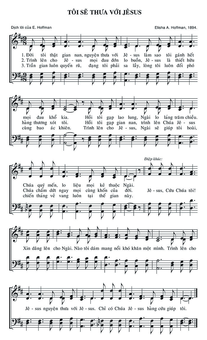 1. Đời tôi thật gian nan, nguyện thưa với Jê-sus làm sao tôi gánh hết mọi đau khổ kia. Hồi tôi gặp lao lung, Ngài lo lắng trăm chiều. Xin dâng lên cho Ngài. Nào tôi dám mang nổi khó khăn một mình. Jê-sus nguyện thưa với Jê-sus. 2. Trình lên cho Jê-sus mọi đau đớn lo buồn, Jê-sus là thiết hữu hàng thương xót tôi. Hồi tôi gặp gian nan, trình lên Chúa Jê-sus. Trình lên cho Jê-sus, Ngài sẽ giúp tôi hoài. Chỉ có Chúa Jê-sus hằng cứu giúp tôi. 3. Trần gian luôn quyến rũ, đặng tôi phải sa lầy, lòng tôi luôn đối phó cùng bao ác khiên. Chúa quý mến, lo liệu mọi kẻ thuộc Ngài. Chúa chấm dứt ngay mọi cùng khốn của đời. chiến thắng vẻ vang luôn tại thế gian này. Điệp khúc: Jê-sus, Cứu Chúa tôi!