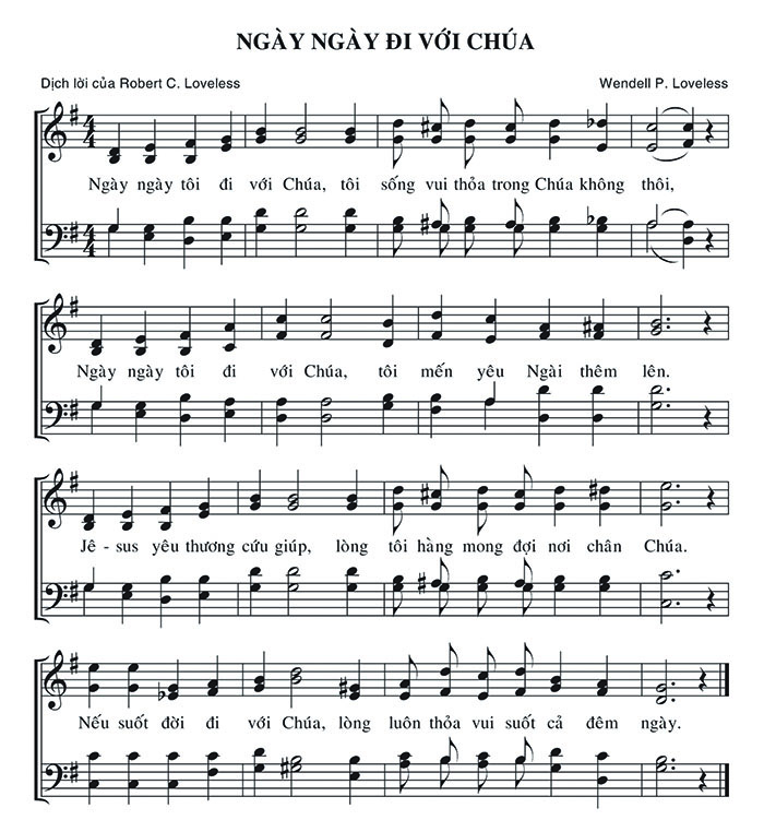 1. Ngày ngày tôi đi với Chúa, tôi sống vui thỏa trong Chúa không thôi, Ngày ngày tôi đi với Chúa, tôi mến yêu Ngài thêm lên. Jê-sus yêu thương cứu giúp, lòng tôi hằng mong đợi nơi chân Chúa. Nếu suốt đời đi với Chúa, lòng luôn thỏa vui suốt cả đêm ngày.