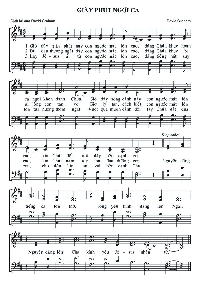 1. Giờ đây giây phút nầy con ngước mắt lên cao, dâng Chúa khúc hoan ca ngợi khen danh Chúa. Giờ đây trong cảnh nầy con ngước mắt lên cao, xin Chúa đến nơi đây bên cạnh con. Nguyện dâng tiếng ca tôn thờ, lòng yêu kính dâng lên Ngài. 2. Dù đau thương ngất đầy con ngước mắt lên cao, dâng Chúa khúc bi ai lòng con tan vỡ. Giờ ly tan, cách biệt con ngước mắt lên cao, xin Chúa nắm tay con, đưa đường con. Nguyện dâng tiếng ca tôn thờ, lòng yêu kính dâng lên Ngài. 3. Lạy Jê-sus ái từ con ngước mắt lên cao, dâng tiếng hát suy tôn tựa hương thơm ngát. Vượt qua muôn cảnh đời tay Chúa dắt đưa con, cho đến lúc an vui bên cạnh Cha. Nguyện dâng tiếng ca tôn thờ, lòng yêu kính dâng lên Ngài. Điệp khúc: Nguyện dâng lên Cha kính yêu Jê-sus nhân từ.