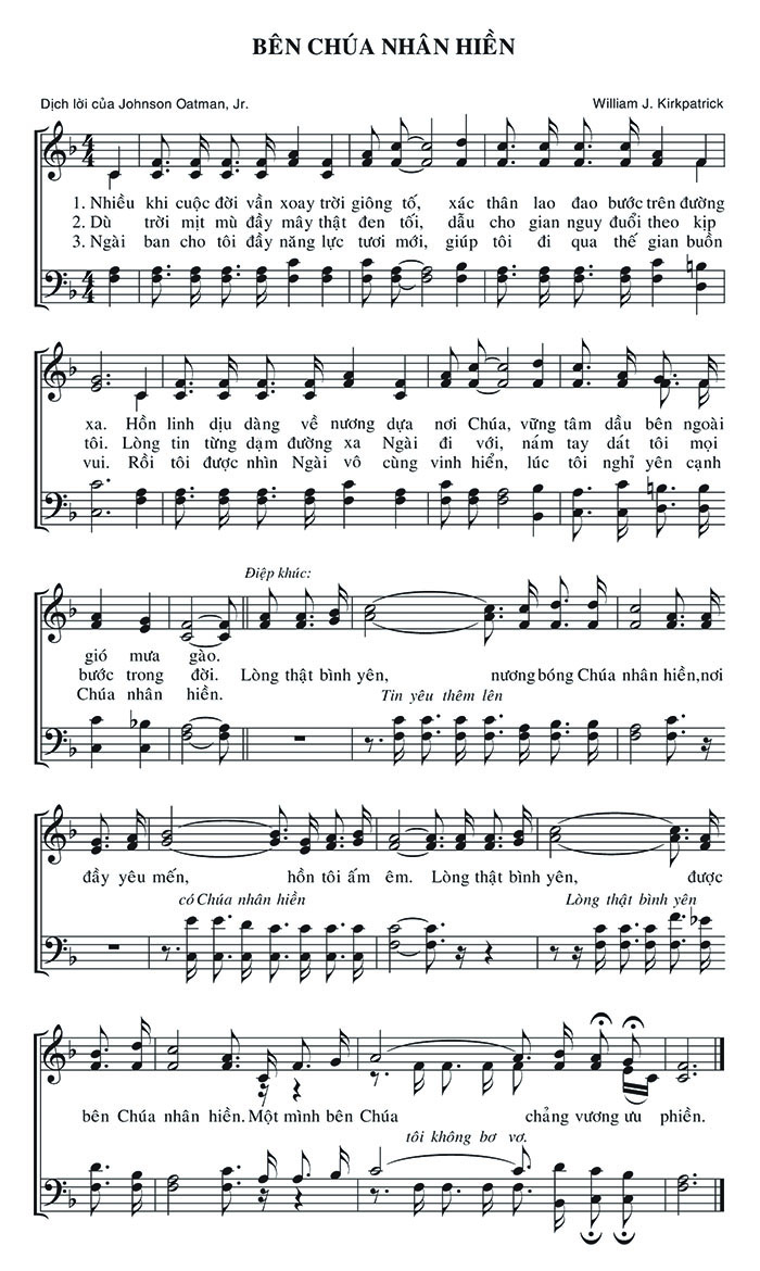 1. Nhiều khi cuộc đời vẫn xoay trời giông tố, xác thân lao đao bước trên đường xa. Hồn linh dịu dàng về nương dựa nơi Chúa, vững tâm dầu bên ngoài tôi. 2. Dù trời mịt mù đầy mây thật đen tối, dẫu cho gian nguy đuổi theo kịp tôi. Lòng tin từng dạm đường xa Ngài đi với, nám tay dát tôi mọi vui. 3. Ngài ban cho tôi đầy năng lực tươi mới, giúp tôi đi qua thế gian buồn vui. Rồi tôi được nhìn Ngài vô cùng vinh hiển, lúc tôi nghỉ yên cạnh tôi không bơ vơ. Điệp khúc: gió mưa gào. nương bóng Chúa nhân hiền, nơi bước trong đời. Lòng thật bình yên, Tin yêu thêm lên Chúa nhân hiền. đầy yêu mến, hồn tôi ấm êm. Lòng thật bình yên, được có Chúa nhân hiền Lòng thật bình yên bên Chúa nhân hiền. Một mình bên Chúa chẳng vương ưu phiền.