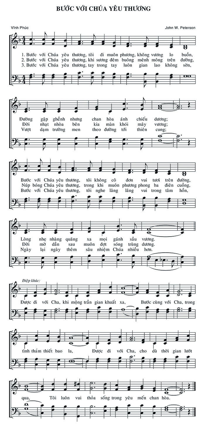 1. Bước với Chúa yêu thương, tôi đi muôn phương, không vương lo buồn, Đường gập ghềnh nhưng chan hòa ánh chiếu dương; Bước với Chúa yêu thương, tôi không cô đơn vui tươi trên đường, Lòng nhẹ nhàng quăng xa mọi gánh sầu vương. 2. Bước với Chúa yêu thương, khi sương đêm buông mênh mông trên đường, Đời nhạt nhòa bên kia màn khói mây vương; Núp bóng Chúa yêu thương, trong khi muôn phương phong ba điên cuồng, Đời mờ dần sau muôn đợt sóng trùng dương. 3. Bước với Chúa yêu thương, tay trong tay luôn gian lao không sờn, Vượt dặm trường men theo đường tới thiên cung; Bước với Chúa yêu thương, tôi nghe lâng lâng vui trong tâm hồn, Ngày lại ngày thêm sâu nhiệm Chúa nhiều hơn. chorus. Được đi với Cha, khi mộng trần gian khuất xa, Bước cùng với Cha, trong tình thắm thiết bao la, Được đi với Cha, cho dù thời gian lướt qua, Tôi luôn vui thỏa sống trong yêu mến chan hòa. Điệp khúc: Được đi với Cha, khi mộng trần gian khuất xa, Bước cùng với Cha, trong tình thắm thiết bao la, Được đi với Cha, cho dù thời gian lướt qua, Tôi luôn vui thỏa sống trong yêu mến chan hòa.