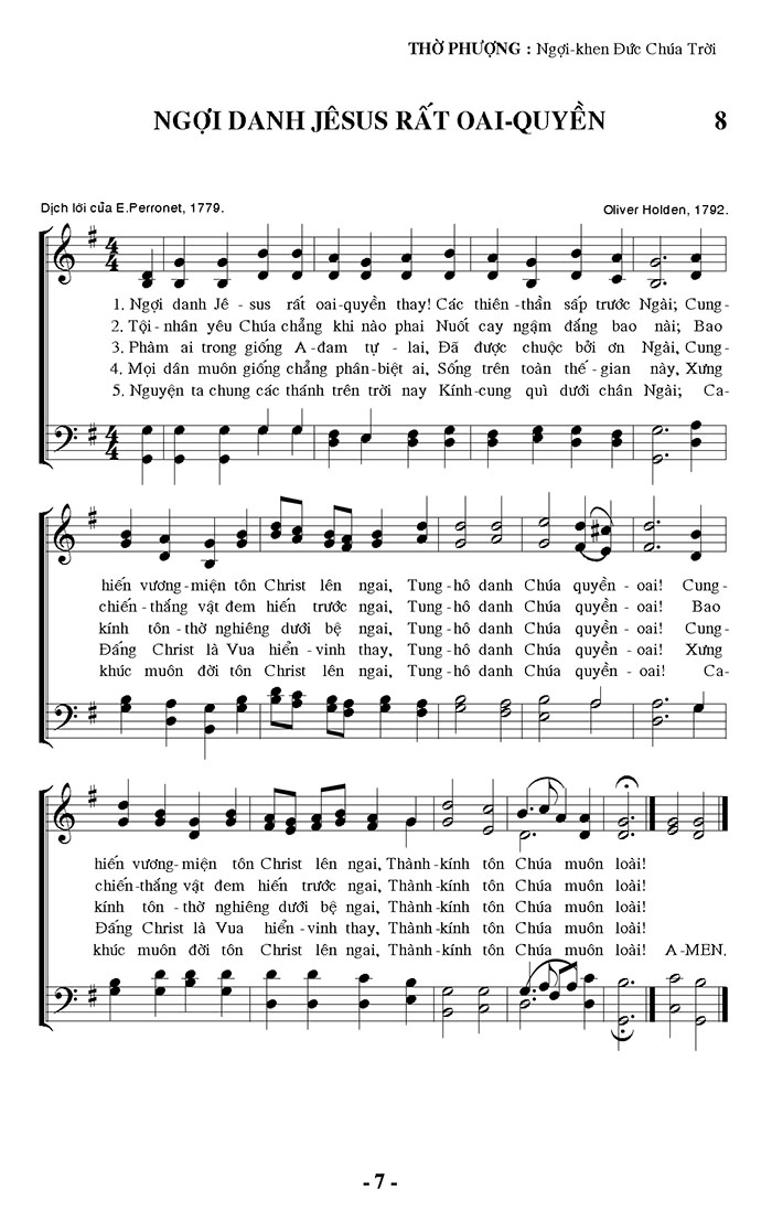1. Ngợi danh Jê-sus rất oai-quyền thay! Các thiên-thần sấp trước Ngài; Cung-hiến vương-miện tôn Christ lên ngai, Tung-hô danh Chúa quyền oai! Cung-hiến vương-miện tôn Christ lên ngai, Thành-kính tôn Chúa muôn loài! 2. Tội-nhân yêu Chúa chẳng khi nào phai Nuốt cay ngậm đắng bao nài; Bao chiến-thắng vật đem hiến trước ngai, Tung-hô danh Chúa quyền oai! Bao chiến thắng vật đem hiến trước ngai, Thành kính tôn Chúa muôn loài! 3. Phàm ai trong giống A-đam tự-lai, Đã được chuộc bởi ơn Ngài, Cung-kính tôn-thờ nghiêng dưới bệ ngai, Tung-hô danh Chúa quyền oai! Cung-kính tôn thờ nghiêng dưới bệ ngai, Thành-kính tôn Chúa muôn loài! 4. Mọi dân muôn giống chẳng phân-biệt ai, Sống trên toàn thế-gian này, Xưng Đấng Christ là Vua hiển-vinh thay, Tung-hô danh Chúa quyền oai! Xưng Đấng Christ là Vua hiển-vinh thay, Thành-kính tôn Chúa muôn loài! 5. Nguyện ta chung các thánh trên trời nay Kính-cung quì dưới chân Ngài; Ca-khúc muôn đời tôn Christ lên ngai, Tung-hô danh Chúa quyền oai! Ca-khúc muôn đời tôn Christ lên ngai, Thành-kính tôn Chúa muôn loài! A-MEN.