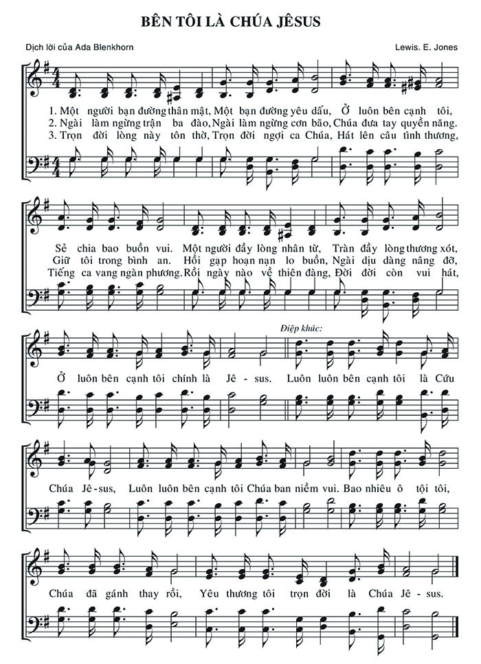 1. Một người bạn đường thân mật, Một bạn đường yêu dấu, Ở luôn bên cạnh tôi, Sẻ chia bao buồn vui. Một người đầy lòng nhân từ, Tràn đầy lòng thương xót, Giữ tôi trong bình an. Chúa đã gánh thay rồi, Yêu thương tôi trọn đời là Chúa Jê-sus. 2. Ngài làm ngừng trận ba đào, Ngài làm ngừng cơn bão, Chúa đưa tay quyền năng. Hồi gạp hoạn nạn lo buồn, Ngài dịu dàng nâng đỡ, Tiếng ca vang ngàn phương. Chúa đã gánh thay rồi, Yêu thương tôi trọn đời là Chúa Jê-sus. 3. Trọn đời lòng này tôn thờ, Trọn đời ngợi ca Chúa, Hát lên câu tình thương, Rồi ngày nào về thiên đàng, Đời đời còn vui hát, Chúa đã gánh thay rồi, Yêu thương tôi trọn đời là Chúa Jê-sus. Điệp khúc: Ở luôn bên cạnh tôi chính là Jê-sus. Luôn luôn bên cạnh tôi là Cứu Chúa Jê-sus, Luôn luôn bên cạnh tôi Chúa ban niềm vui. Bao nhiêu ô tội tôi, Chúa đã gánh thay rồi, Yêu thương tôi trọn đời là Chúa Jê-sus.