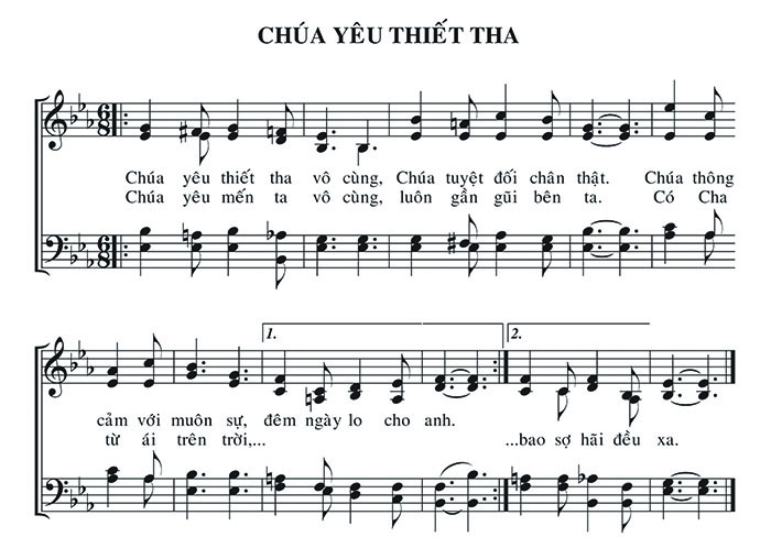1. Chúa yêu thiết tha vô cùng, Chúa tuyệt đối chân thật. Chúa thông cảm với muôn sự, đêm ngày lo cho anh. ...bao sợ hãi đều xa. 2. Chúa yêu mến ta vô cùng, luôn gần gũi bên ta. Có Cha từ ái trên trời,...