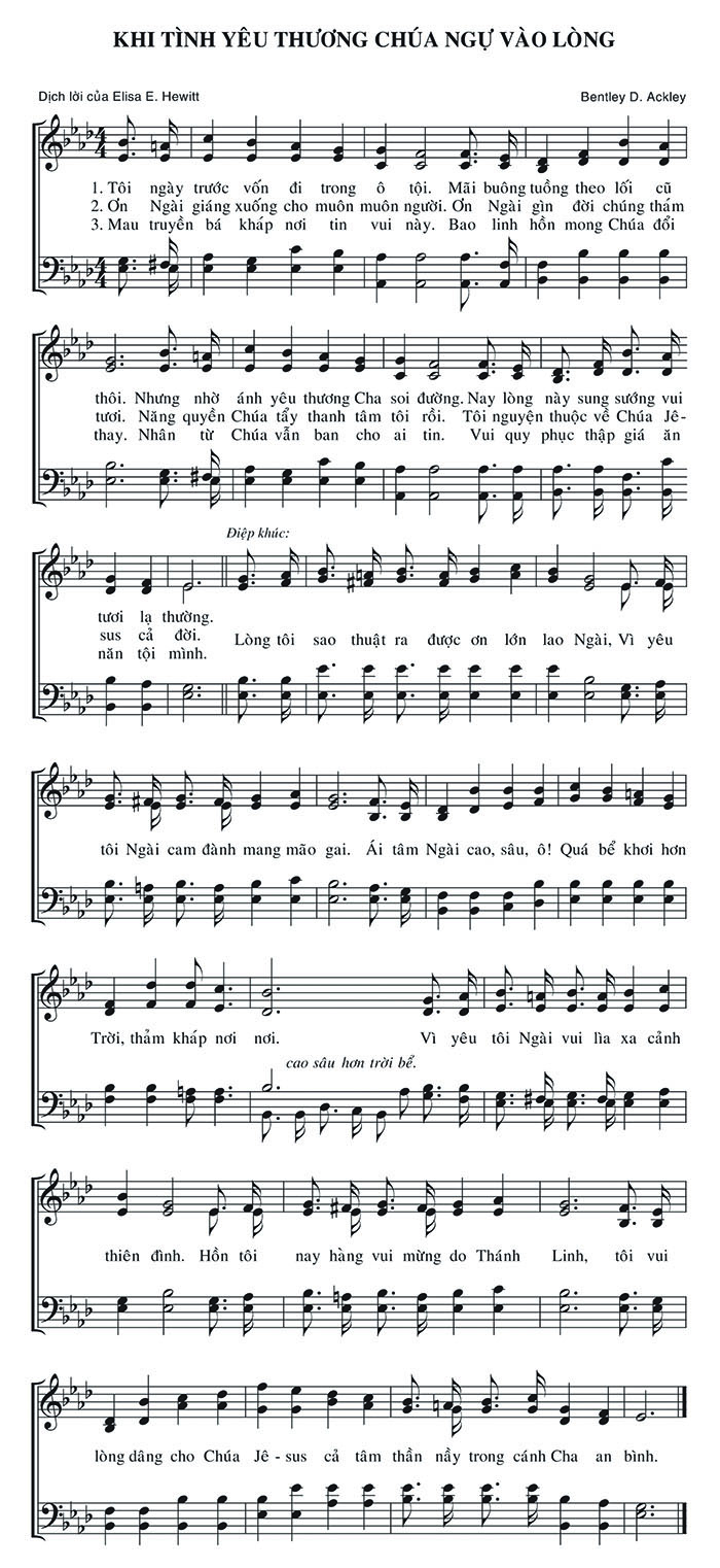 1. Tôi ngày trước vốn đi trong ô tội. Mãi buông tuồng theo lối cũ thôi. Nhưng nhờ ánh yêu thương Cha soi đường. Nay lòng này sung sướng vui tươi lạ thường. 2. Ơn Ngài giáng xuống cho muôn muôn người. Ơn Ngài gìn đời chúng thám tươi. Năng quyền Chúa tẩy thanh tâm tôi rồi. Tôi nguyện thuộc về Chúa Jê-sus cả đời. 3. Mau truyền bá kháp nơi tin vui này. Bao linh hồn mong Chúa đổi thay. Nhân từ Chúa vẫn ban cho ai tin. Vui quy phục thập giá ăn năn tội mình. Điệp khúc: Lòng tôi sao thuật ra được ơn lớn lao Ngài, Vì yêu tôi Ngài cam đành mang mão gai. Ái tâm Ngài cao, sâu, ô! Quá bể khơi hơn Trời, thảm kháp nơi nơi. Vì yêu tôi Ngài vui lìa xa cảnh cao sâu hơn trời bể. thiên đình. Hồn tôi nay hàng vui mừng do Thánh Linh, tôi vui lòng dâng cho Chúa Jê-sus cả tâm thần nầy trong cánh Cha an bình.