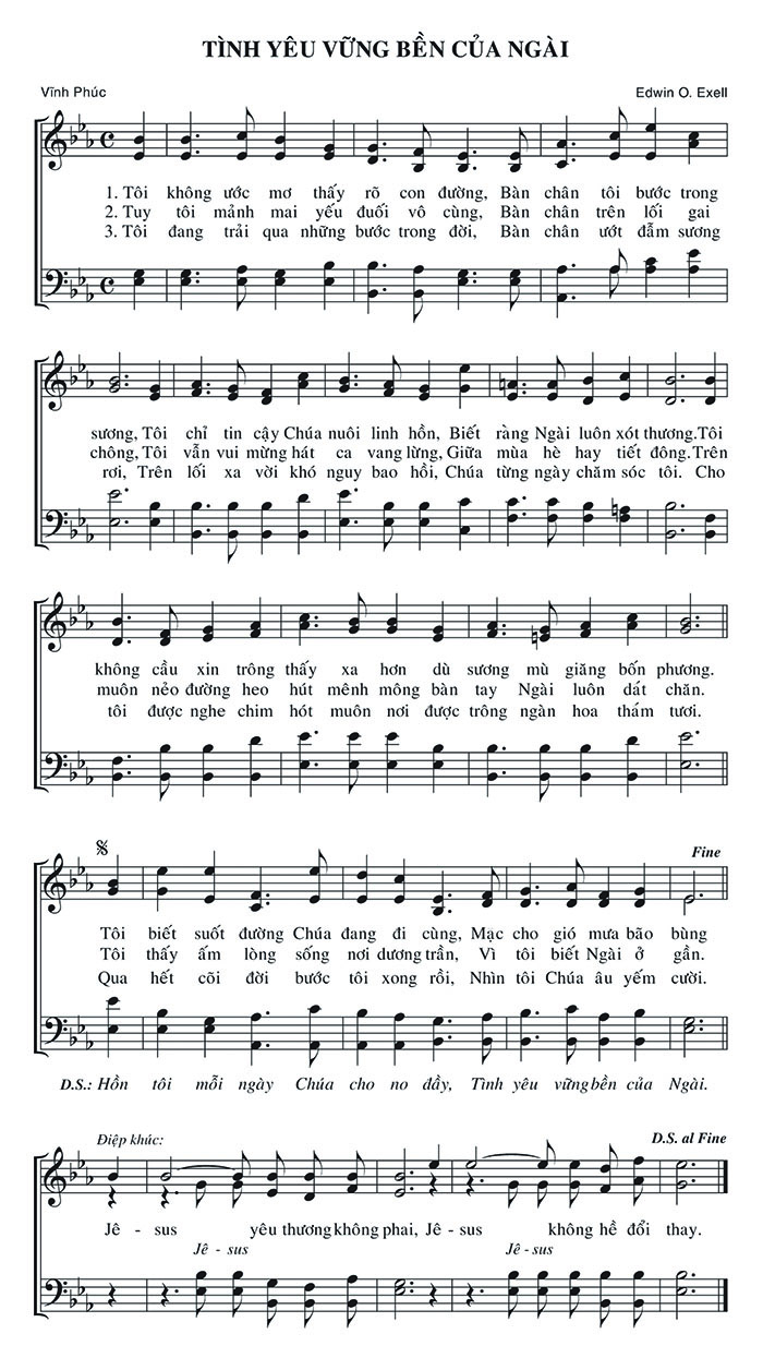 1. Tôi không ước mơ thấy rõ con đường, Bàn chân tôi bước trong sương, Tôi chỉ tin cậy Chúa nuôi linh hồn, Biết rằng Ngài luôn xót thương. Tôi không cầu xin trông thấy xa hơn dù sương mù giăng bốn phương. Tôi biết suốt đường Chúa đang đi cùng, Mạc cho gió mưa bão bùng. 2. Tuy tôi mảnh mai yếu đuối vô cùng, Bàn chân trên lối gai chông, Tôi vẫn vui mừng hát ca vang lừng, Giữa mùa hè hay tiết đông. Trên muôn nẻo đường heo hút mênh mông bàn tay Ngài luôn dát chăn. Tôi thấy ấm lòng sống nơi dương trần, Vì tôi biết Ngài ở gần. 3. Tôi đang trải qua những bước trong đời, Bàn chân ướt đẫm sương rơi, Trên lối xa vời khó nguy bao hồi, Chúa từng ngày chăm sóc tôi. Cho tôi được nghe chim hót muôn nơi được trông ngàn hoa thám tươi. Qua hết cõi đời bước tôi xong rồi, Nhìn tôi Chúa âu yếm cười. Điệp khúc: Hồn tôi mỗi ngày Chúa cho no đầy, Tình yêu vững bền của Ngài. Jê-sus yêu thương không phai, Jê-sus không hề đổi thay. Jê-sus