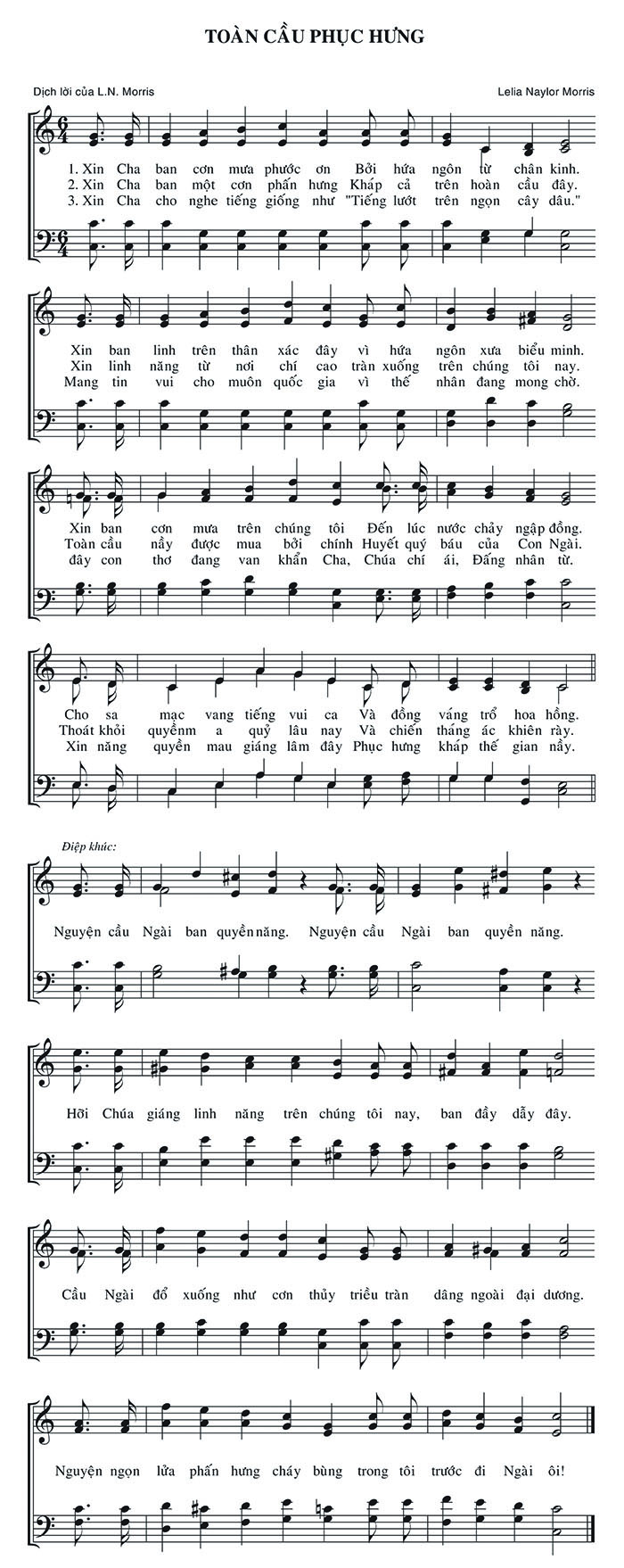 1. Xin Cha ban cơn mưa phước ơn Bởi hứa ngôn từ chân kinh. Xin ban linh trên thân xác đây vì hứa ngôn xưa biểu minh. Xin ban cơn mưa trên chúng tôi Đến lúc nước chảy ngập đồng. Cho sa mạc vang tiếng vui ca Và đồng vắng trổ hoa hồng. 2. Xin Cha ban một cơn phấn hưng Khắp cả trên hoàn cầu đây. Xin linh năng từ nơi chí cao tràn xuống trên chúng tôi nay. Toàn cầu nầy được mua bởi chính Huyết quý báu của Con Ngài. Thoát khỏi quyền ma quỷ lâu nay Và chiến thắng ác khiên rày. 3. Xin Cha cho nghe tiếng giống như "Tiếng lướt trên ngọn cây dâu." Mang tin vui cho muôn quốc gia vì thế nhân đang mong chờ. đây con thơ đang van khẩn Cha, Chúa chí ái, Đấng nhân từ. Xin năng quyền mau giáng lâm đây Phục hưng khắp thế gian nầy. chorus. Nguyện cầu Ngài ban quyền năng. Nguyện cầu Ngài ban quyền năng. Hỡi Chúa giáng linh năng trên chúng tôi nay, ban đầy dẫy đây. Cầu Ngài đổ xuống như cơn thủy triều tràn dâng ngoài đại dương. Nguyện ngọn lửa phấn hưng cháy bùng trong tôi trước đi Ngài ôi!