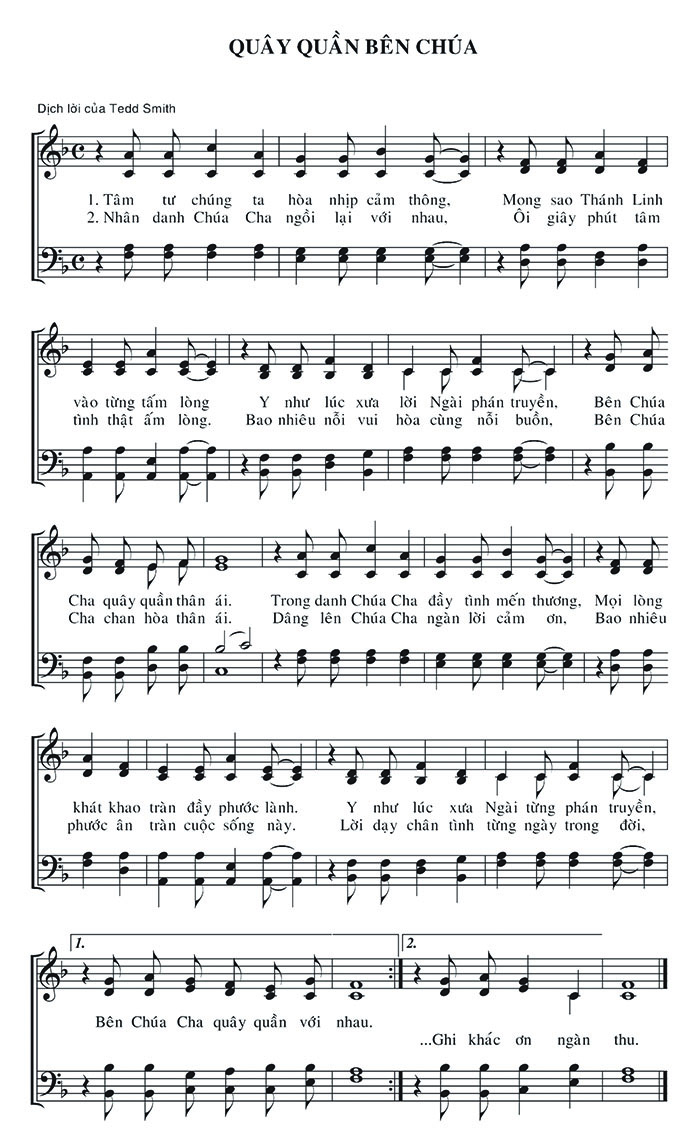 1. Tâm tư chúng ta hòa nhịp cảm thông, Mong sao Thánh Linh vào từng tấm lòng tình thật ấm lòng. Cha quây quần thân ái. Trong danh Chúa Cha đầy tình mến thương, Mọi lòng khát khao tràn đầy phước lành. Bên Chúa Cha quây quần với nhau. 2. Nhân danh Chúa Cha ngồi lại với nhau, Ôi giây phút tâm Y như lúc xưa lời Ngài phán truyền, Bao nhiêu nỗi vui hòa cùng nỗi buồn, Bên Chúa Cha chan hòa thân ái. Dâng lên Chúa Cha ngàn lời cảm ơn, Bao nhiêu phước ân trần cuộc sống này. Y như lúc xưa Ngài từng phán truyền, Lời dạy chân tình từng ngày trong đời, ...Ghi khác ơn ngàn thu.