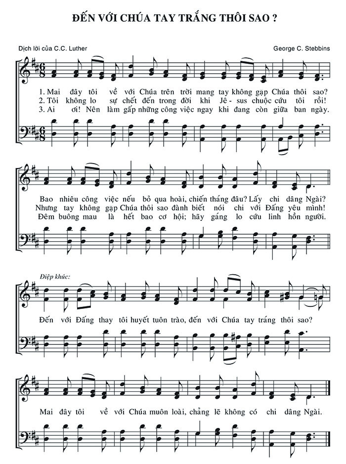 1. Mai đây tôi về với Chúa trên trời mang tay không gặp Chúa thôi sao? Bao nhiêu công việc nếu bỏ qua hoài, chiến thắng đâu? Lấy chi dâng Ngài? 2. Tôi không lo sự chết đến trong đời khi Jê-sus chuộc cứu tôi rồi! Nhưng tay không gặp Chúa thôi sao đành biết nói chi với Đấng yêu mình! 3. Ai ơi! Nên làm gấp những công việc ngay khi đang còn giữa ban ngày. Đêm buông mau là hết bao cơ hội; hãy gáng lo cứu linh hồn người. Điệp khúc: Đến với Đấng thay tôi huyết tuôn trào, đến với Chúa tay trắng thôi sao? Mai đây tôi về với Chúa muôn loài, chẳng lẽ không có chi dâng Ngài.