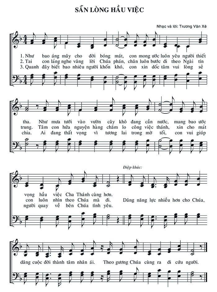 1. Như bao áng mây cho đời bóng mát, con mong ước luôn yêu người thiết tha. Như mưa tưới vào vườn cây khô đang cần nước, mang bao ước vọng hầu việc Cha Thánh càng hơn. Dâng năng lực nhiều hơn cho Chúa, dâng cuộc đời thành tâm nhân ái. Theo gương Chúa cùng ra đi cứu người. 2. Tai con lắng nghe vâng lời Chúa phán, chân luôn bước đi theo Ngài tín trung. Tâm con hứa nguyện hàng chăm lo công việc thánh, xin cho mát con luôn nhìn theo Chúa mà đi. Dâng năng lực nhiều hơn cho Chúa, dâng cuộc đời thành tâm nhân ái. Theo gương Chúa cùng ra đi cứu người. 3. Quanh đây biết bao nhiêu người khốn khó, con xin dốc tâm vui lòng sẻ chia. Ai đang thất vọng vì tương lai trong mờ tối, con vui giúp người quay về bên Chúa tình yêu. Dâng năng lực nhiều hơn cho Chúa, dâng cuộc đời thành tâm nhân ái. Theo gương Chúa cùng ra đi cứu người. Điệp khúc: Dâng năng lực nhiều hơn cho Chúa, dâng cuộc đời thành tâm nhân ái. Theo gương Chúa cùng ra đi cứu người.