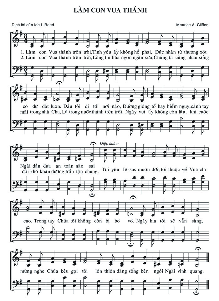 1. Làm con Vua thánh trên trời, Tình yêu ấy không hề phai, Đức nhân từ thương xót có dư dật luôn. Dầu tôi đi tới nơi nào, Đường giông tố hay hiểm nguy, cánh tay Ngài dẫn đưa an toàn nào sai. 2. Làm con Vua thánh trên trời, Lòng tin hứa ngôn ngàn xưa, Chúng ta cùng nhau sống mãi trong nhà Cha, Là trong nước thánh trên trời, Ngày vui ấy không còn lâu, khi cuộc đời khó khăn dương trần tận chung. Điệp khúc: Tôi yêu Jê-sus muôn đời, tôi thuộc về Vua chí cao. Trong tay Chúa tôi không còn bị bơ vơ. Ngày kia tôi sẽ vẫn sàng, mừng nghe Chúa kêu gọi tôi lên thiên đàng sống bên ngôi Ngài vinh quang.