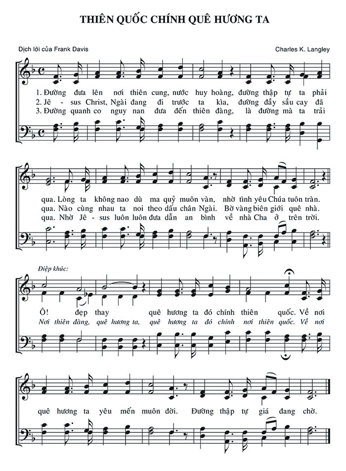 1. Đường đưa lên nơi thiên cung, nước huy hoàng, đường thập tự ta phải qua. Lòng ta không nao dù ma quỷ muôn vàn, nhờ tình yêu Chúa tuôn tràn. 2. Jê-sus Christ, Ngài đang đi trước ta kìa, đường đầy sầu cay đã qua. Nào cùng nhau ta noi theo dấu chân Ngài. Bờ vàng biên giới quê nhà. 3. Đường quanh co nguy nan đưa đến thiên đàng, là đường mà ta trải qua. Nhờ Jê-sus luôn luôn đưa dẫn an bình về nhà Cha ở trên trời. 4. Ô! đẹp thay quê hương ta đó chính thiên quốc. Về nơi Nơi thiên đàng, quê hương ta, quê hương ta đó chính nơi thiên quốc. Về nơi quê hương ta yêu mến muôn đời. Đường thập tự giá đang chờ. Điệp khúc: Ô! đẹp thay quê hương ta đó chính thiên quốc. Về nơi Nơi thiên đàng, quê hương ta, quê hương ta đó chính nơi thiên quốc. Về nơi quê hương ta yêu mến muôn đời. Đường thập tự giá đang chờ.