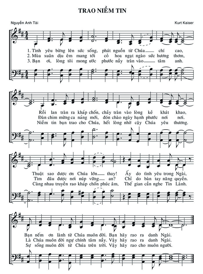 1. Tình yêu bừng lên sức sống, phát nguồn từ Chúa chí cao, Rồi lan tràn ra khắp chốn, chảy tràn vào lòng kẻ khát khao, Thuật sao được ơn Chúa lớn thay! Ấy do tình yêu trong Ngài, Bạn nếm ơn lành từ Chúa muôn đời. Bạn hãy rao ra danh Ngài. 2. Mùa xuân dịu êm mang tới cỏ hoa ngạt ngào sức hương thơm, Đàn chim mừng ca náng mới, đón chào ngày hạnh phước nơi nơi. Tìm đâu được nơi núp vững an? Chỉ do bàn tay năng quyền. Là Chúa muôn đời ngự chính tâm nầy. Vậy hãy rao ra danh Ngài. 3. Bạn ơi, lòng tôi mong ước phước nầy tràn vào tâm anh. Niềm tin bạn trao cho Chúa, hết lòng nhờ cậy Chúa yêu thương. Cùng nhau truyền rao khắp chốn phúc âm, Thế gian cần nghe Tin Lành. Sự sống muôn đời từ Chúa trên trời. Vậy hãy rao cho muôn người.