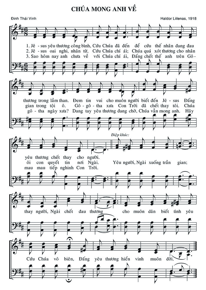 1. Jê - sus yêu thương công bình, Cứu Chúa đã đến để cứu thế nhân đang đau thương trong lầm than. Đem tin vui cho muôn người biết đến Jê - sus Đấng yêu thương chết thay cho người. 2. Jê - sus oai nghi, nhân từ, Cứu Chúa chí ái; Chúa quá xót thương cho nhân gian trong tội ô. Gô - gô - tha xưa Con Trời đã chết thay tôi. Chúa ôi con quyết tin nơi Ngài. 3. Sao hôm nay anh chưa về với Chúa chí ái, Đấng chết thế anh trên Gô - gô - tha ngày xưa? Dang tay yêu thương đang chờ, Chúa vẫn mong anh. Hãy mau mau tiếp nghinh Con Trời. Điệp khúc: Yêu người, Ngài xuống trần gian; thay người, Ngài chết đau thương cho muôn dân biết tình yêu Cứu Chúa vô biên, Đấng yêu thương hiển vinh muôn đời.