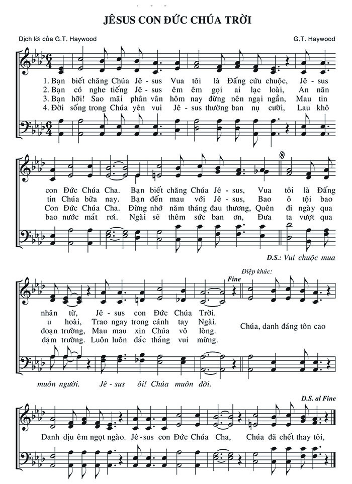 1. Bạn biết chăng Chúa Jê-sus Vua tôi là Đấng cứu chuộc, Jê-sus con Đức Chúa Cha. Bạn biết chăng Chúa Jê-sus, Vua tôi là Đấng nhân từ, Jê-sus con Đức Chúa Trời. Danh dịu êm ngọt ngào. Jê-sus con Đức Chúa Cha, Chúa đã chết thay tôi, 2. Bạn có nghe tiếng Jê-sus êm êm gọi ai lạc loài, tin Chúa bữa nay. Bạn đến mau với Jê-sus, Bao ô tội bao u hoài, Trao ngay trong cánh tay Ngài. muôn người. 3. Bạn hỡi! Sao mãi phân vân hôm nay đừng nên ngại ngần, Mau tin Con Đức Chúa Cha. Đừng nhớ năm tháng đau thương, Quên đi ngày qua đoạn trường, Mau mau xin Chúa vô lòng. Jê-sus ôi! Chúa muôn đời. 4. Đời sống trong Chúa yên vui Jê-sus thường ban nụ cười, Lau khô bao nước mắt rơi. Ngài sẽ thêm sức ban ơn, Đưa ta vượt qua dạm trường. Luôn luôn đác tháng vui mừng. Điệp khúc: Vui chuộc mua Chúa, danh đáng tôn cao