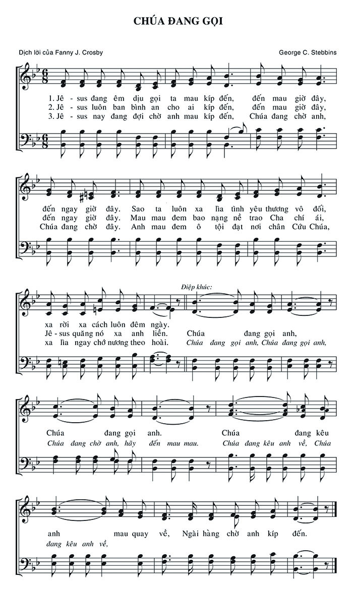 1. Jê-sus đang êm dịu gọi ta mau kíp đến, đến mau giờ đây, đến ngay giờ đây. Sao ta luôn xa lìa tình yêu thương vô đối, xa rời xa cách luôn đêm ngày. 2. Jê-sus luôn ban bình an cho ai kíp đến, đến mau giờ đây, đến ngay giờ đây. Mau mau đem bao nặng nề trao Cha chí ái, Jê-sus quăng nó xa anh liền. 3. Jê-sus nay đang đợi chờ anh mau kíp đến, Chúa đang chờ anh, Chúa đang chờ đây. Anh mau đem ô tội đặt nơi chân Cứu Chúa, xa lìa ngay chớ nương theo hoài. 4. Chúa đang gọi anh, Chúa đang chờ anh, hãy đến mau mau. Chúa đang kêu anh về, Chúa anh mau quay về, Ngài hàng chờ anh kíp đến. Chúa đang kêu anh về, Điệp khúc: Chúa đang gọi anh, Chúa đang gọi anh, Chúa đang gọi anh, Chúa đang gọi anh. Chúa đang kêu anh về, Chúa đang kêu anh về.