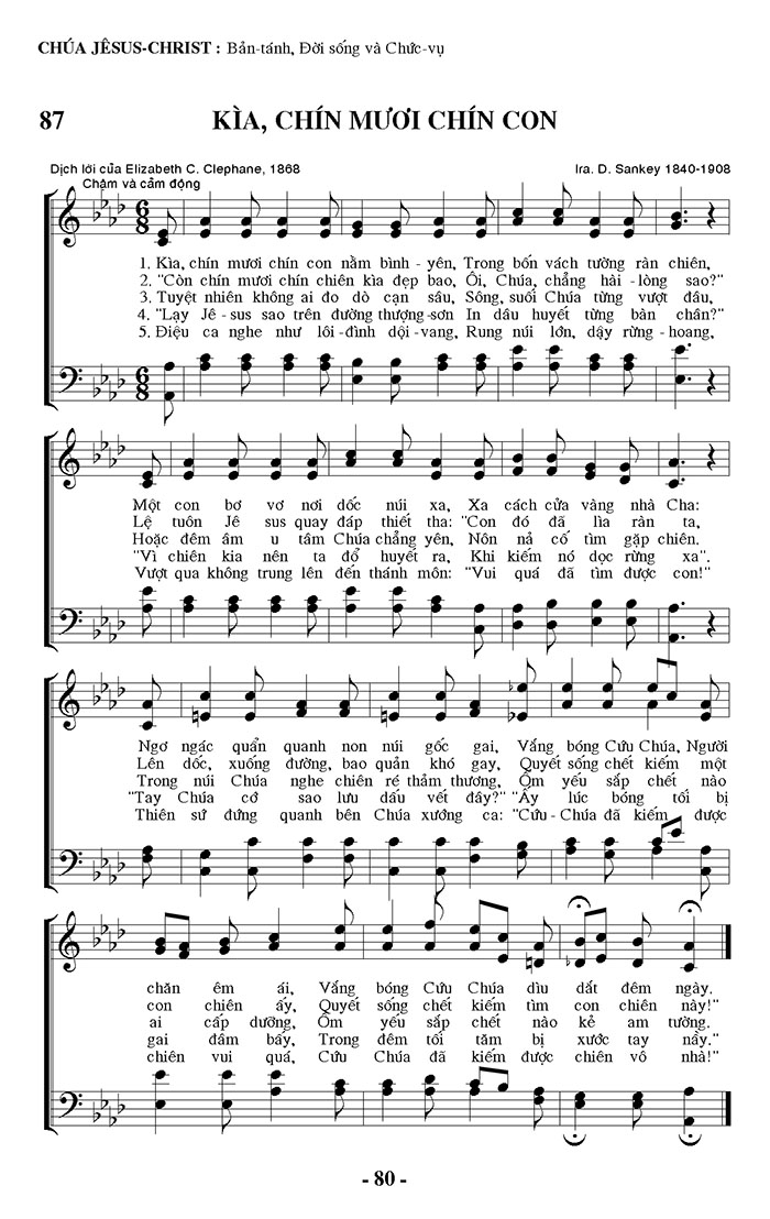 1. Kìa, chín mươi chín con nằm bình yên, Trong bốn vách tường ràn chiên, Một con bơ vơ nơi dốc núi xa, Xa cách cửa vàng nhà Cha: Ngơ ngác quẩn quanh non núi gốc gai, Vắng bóng Cứu Chúa, Người chăn êm ái, Vắng bóng Cứu Chúa dìu dắt đêm ngày. 2. "Còn chín mươi chín chiên kìa đẹp bao, Ôi, Chúa, chẳng hài lòng sao?" Lệ tuôn Jê sus quay đáp thiết tha: "Con đó đã lìa ràn ta, Lên dốc, xuống đường, bao quản khó gay, Quyết sống chết kiếm một con chiên ấy, Quyết sống chết kiếm tìm con chiên này!" 3. Tuyệt nhiên không ai đo dò cạn sâu, Sông, suối Chúa từng vượt đầu, Hoặc đêm âm u tâm Chúa chẳng yên, Nôn nả cố tìm gặp chiên. Trong núi Chúa nghe chiên rẻ thảm thương, Ôm yếu sắp chết nào ai cấp dưỡng, Ôm yếu sắp chết nào kẻ am tường. 4. "Lạy Jê-sus sao trên đường thượng sơn In dấu huyết từng bàn chân?" "Vì chiên kia nên ta đổ huyết ra, Khi kiếm nó dọc rừng xa". "Tay Chúa có sao lưu dấu vết đây?" "Ấy lúc bóng tối bị gai đâm bấy, Trong đêm tối tăm bị xước tay nấy." 5. Điệu ca nghe như lôi đình dội - vang, Rung núi lớn, dậy rừng hoang, Vượt qua không trung lên đến thánh môn: "Vui quá đã tìm được con!" Thiên sứ đứng quanh bên Chúa xướng ca: "Cứu - Chúa đã kiếm được chiên vui quá, Cứu Chúa đã kiếm được chiên vô nhà!"