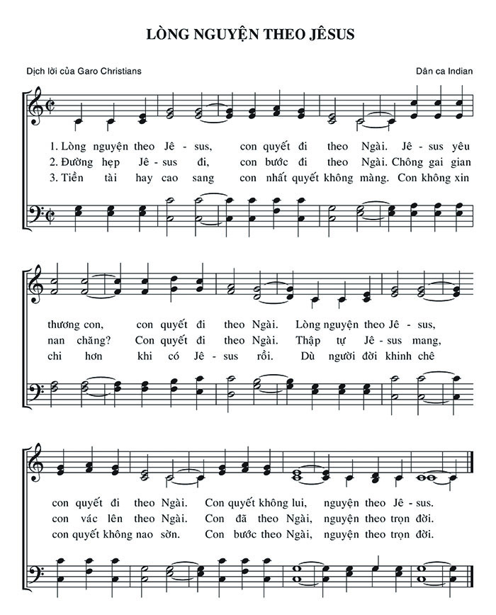 1. Lòng nguyện theo Jê-sus, con quyết đi theo Ngài. Jê-sus yêu thương con, con quyết đi theo Ngài. Lòng nguyện theo Jê-sus, con quyết không lui, nguyện theo Jê-sus. 2. Đường hẹp Jê-sus đi, con bước đi theo Ngài. Chông gai gian nan chăng? Con quyết đi theo Ngài. Thập tự Jê-sus mang, con vác lên theo Ngài. Con đã theo Ngài, nguyện theo trọn đời. 3. Tiền tài hay cao sang con nhất quyết không màng. Con không xin chi hơn khi có Jê-sus rồi. Dù người đời khinh chê con quyết không nao sờn. Con bước theo Ngài, nguyện theo trọn đời.