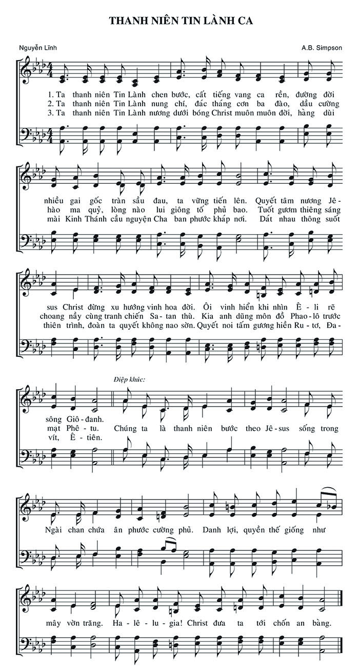 1. Ta thanh niên Tin Lành chen bước, cất tiếng vang ca rền, đường đời nhiều gai gốc tràn sầu đau, ta vững tiến lên. Quyết tâm nương Jê-sus Christ đừng xu hướng vinh hoa đời. Ôi vinh hiển khi nhìn Ê-li rẽ sông Giô-đanh. 2. Ta thanh niên Tin Lành nung chí, đác tháng cơn ba đào, dầu cường hào ma quỷ, lòng nào lui giông tố phủ bao. Tuốt gươm thiêng sáng choang nầy cùng tranh chiến Sa-tan thù. Kia anh dũng môn đồ Phao-lô trước mặt Phê-tu. 3. Ta thanh niên Tin Lành nương dưới bóng Christ muôn muôn đời, hàng dùi mài Kinh Thánh cầu nguyện Cha ban phước kháp nơi. Dát nhau thông suốt thiên trình, đoàn ta quyết không nao sờn. Quyết noi tấm gương hiền Ru-tơ, Đa-vít, Ê-tiên. Điệp khúc: Chúng ta là thanh niên bước theo Jê-sus sống trong Ngài chan chứa ân phước cường phủ. Danh lợi, quyền thế giống như mây vờn trăng. Ha-lê-lu-gia! Christ đưa ta tới chốn an bằng.