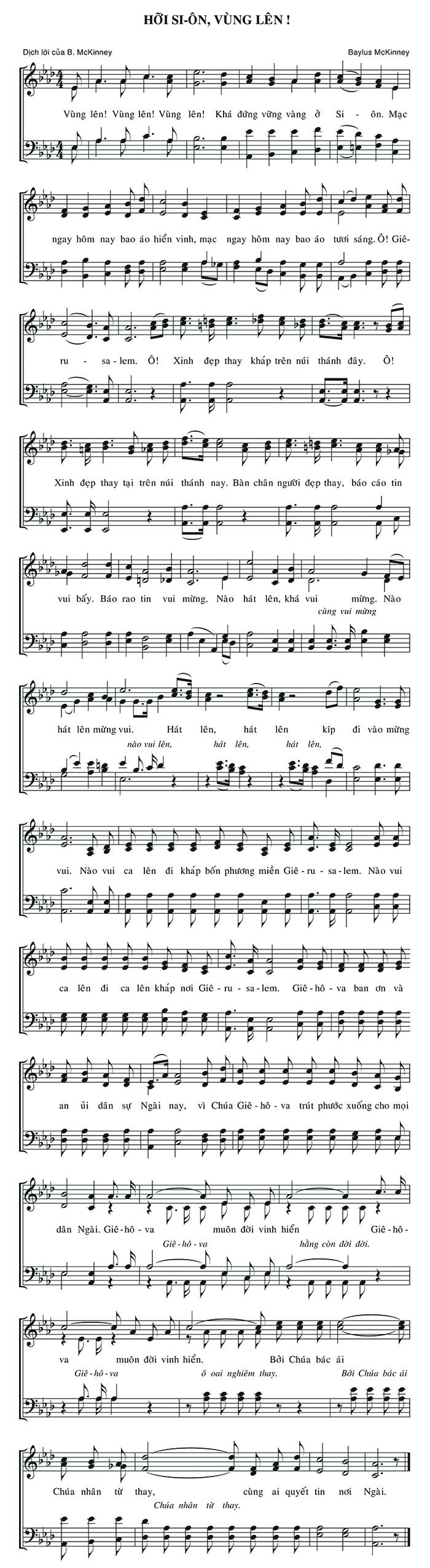 1. Vùng lên! Vùng lên! Vùng lên! Khá đứng vững vàng ở Si - ôn. Mạc ngay hôm nay bao áo hiển vinh, mạc ngay hôm nay bao áo tươi sáng. Ô! Giê-ru - sa-lem. Ô! Xinh đẹp thay khắp trên núi thánh đây. Ô! Xinh đẹp thay tại trên núi thánh nay. Bàn chân người đẹp thay, báo cáo tin vui bấy. Báo rao tin vui mừng. Nào hát lên, khá vui mừng. Nào hát lên mừng vui. Hát lên, hát lên kíp đi vào mừng vui. Nào vui ca lên đi khắp bốn phương miền Giê - ru - sa-lem. Nào vui ca lên đi ca lên khắp nơi Giê-ru sa-lem. Giê - hô - va ban ơn và an ủi dân sự Ngài nay, vì Chúa Giê-hô-va trút phước xuống cho mọi dân Ngài. Giê-hô-va muôn đời vinh hiển hằng còn đời đời. Giê-hô-va muôn đời vinh hiển. Bởi Chúa bác ái ô oai nghiêm thay. Bởi Chúa bác ái Chúa nhân từ thay, cùng ai quyết tin nơi Ngài. Chúa nhân từ thay. 2. Vùng lên! Vùng lên! Vùng lên! Khá đứng vững vàng ở Si - ôn. Mạc ngay hôm nay bao áo hiển vinh, mạc ngay hôm nay bao áo tươi sáng. Ô! Giê-ru - sa-lem. Ô! Xinh đẹp thay khắp trên núi thánh đây. Ô! Xinh đẹp thay tại trên núi thánh nay. Bàn chân người đẹp thay, báo cáo tin vui bấy. Báo rao tin vui mừng. Nào hát lên, khá vui mừng. Nào hát lên mừng vui. Hát lên, hát lên kíp đi vào mừng vui. Nào vui ca lên đi khắp bốn phương miền Giê - ru - sa-lem. Nào vui ca lên đi ca lên khắp nơi Giê-ru sa-lem. Giê - hô - va ban ơn và an ủi dân sự Ngài nay, vì Chúa Giê-hô-va trút phước xuống cho mọi dân Ngài. Giê-hô-va muôn đời vinh hiển hằng còn đời đời. Giê-hô-va muôn đời vinh hiển. Bởi Chúa bác ái ô oai nghiêm thay. Bởi Chúa bác ái Chúa nhân từ thay, cùng ai quyết tin nơi Ngài. Chúa nhân từ thay. 3. Vùng lên! Vùng lên! Vùng lên! Khá đứng vững vàng ở Si - ôn. Mạc ngay hôm nay bao áo hiển vinh, mạc ngay hôm nay bao áo tươi sáng. Ô! Giê-ru - sa-lem. Ô! Xinh đẹp thay khắp trên núi thánh đây. Ô! Xinh đẹp thay tại trên núi thánh nay. Bàn chân người đẹp thay, báo cáo tin vui bấy. Báo rao tin vui mừng. Nào hát lên, khá vui mừng. Nào hát lên mừng vui. Hát lên, hát lên kíp đi vào mừng vui. Nào vui ca lên đi khắp bốn phương miền Giê - ru - sa-lem. Nào vui ca lên đi ca lên khắp nơi Giê-ru sa-lem. Giê - hô - va ban ơn và an ủi dân sự Ngài nay, vì Chúa Giê-hô-va trút phước xuống cho mọi dân Ngài. Giê-hô-va muôn đời vinh hiển hằng còn đời đời. Giê-hô-va muôn đời vinh hiển. Bởi Chúa bác ái ô oai nghiêm thay. Bởi Chúa bác ái Chúa nhân từ thay, cùng ai quyết tin nơi Ngài. Chúa nhân từ thay.